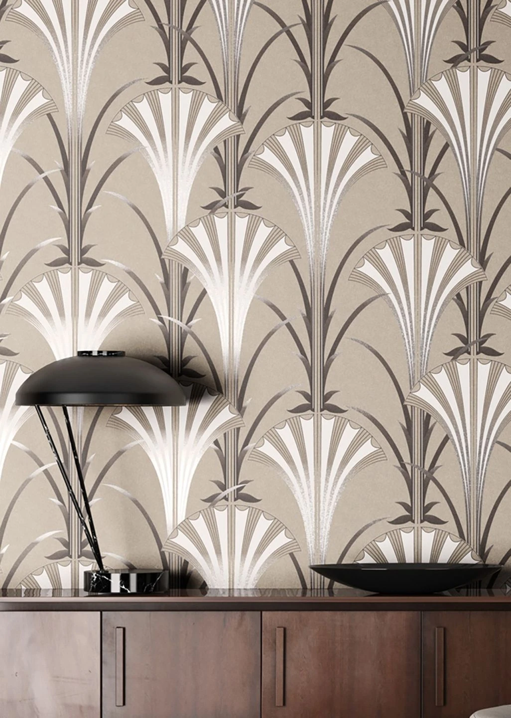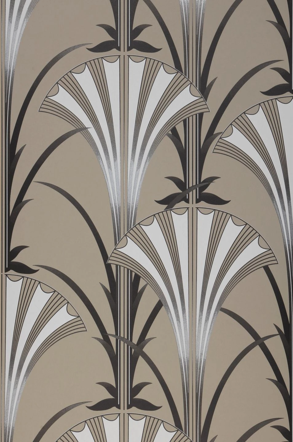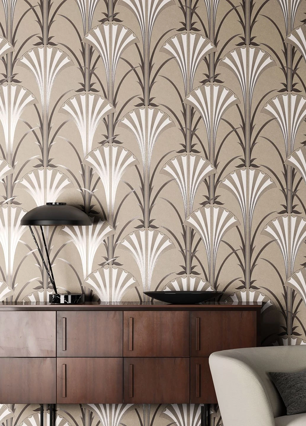 Kostbare Eleganz, wie sie für die Epoche des Art Deco typisch war, zieht mit der Vliestapete „Morley“ bei Ihnen ein. Die stilisierten fächerförmigen Blütenkelche und Blätter in Perlhellgrau, Schwarz und Weiß harmonieren perfekt mit dem beigegrauen Grund. In Verbindung mit Möbeln in warmen, dunklen Holztönen, aber auch in Cremefarben, schaffen Sie ein Zuhause mit Schick und Individualität.