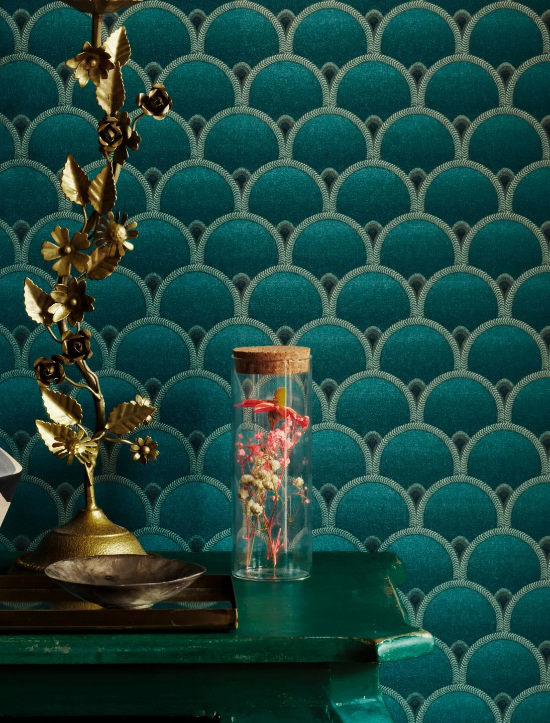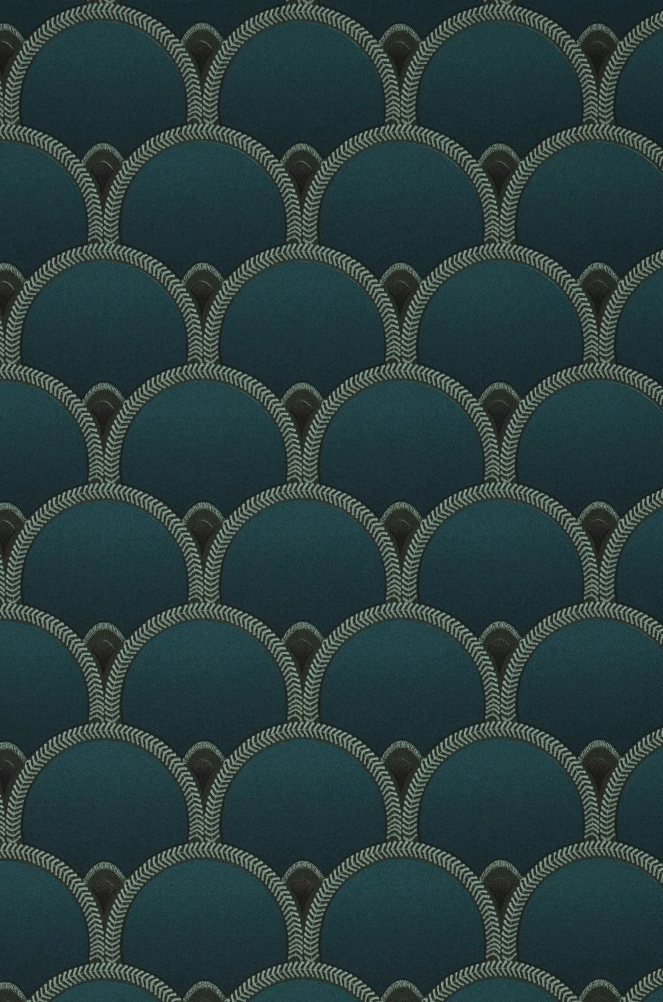 Schuppenartig angeordnet sind die wie Fächer geformten Ornamente, die eine Synthese zwischen dem Stil des Art Deco und einer modernen Tapete herstellen. Das tiefe Blaugrün, kombiniert mit Dunkelgrau, Olivgrün und Zartgrün, erweckt den Eindruck von ruhiger Eleganz. Durch die hoch waschbeständige Oberfläche aus Vinyl lässt sich Moxie auch in Ihrem Badezimmer problemlos verwenden. Aber auch Ihr Wohn- oder Schlafzimmer gestaltet sie individuell und stilvoll.