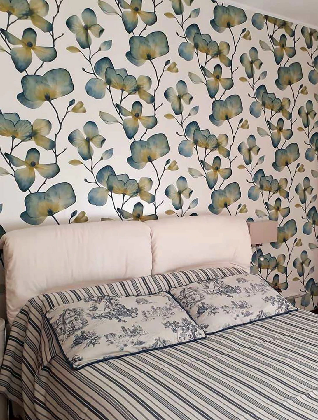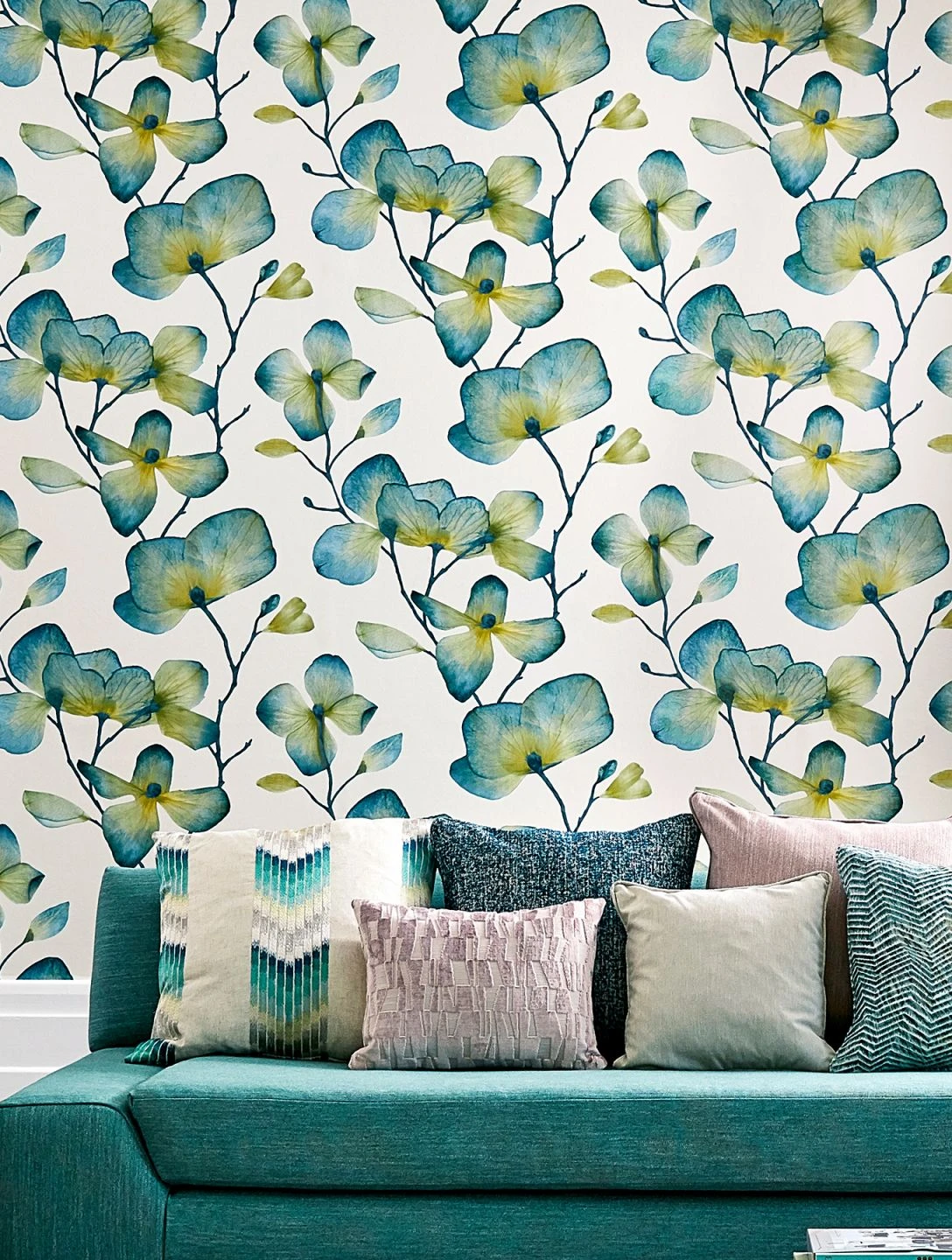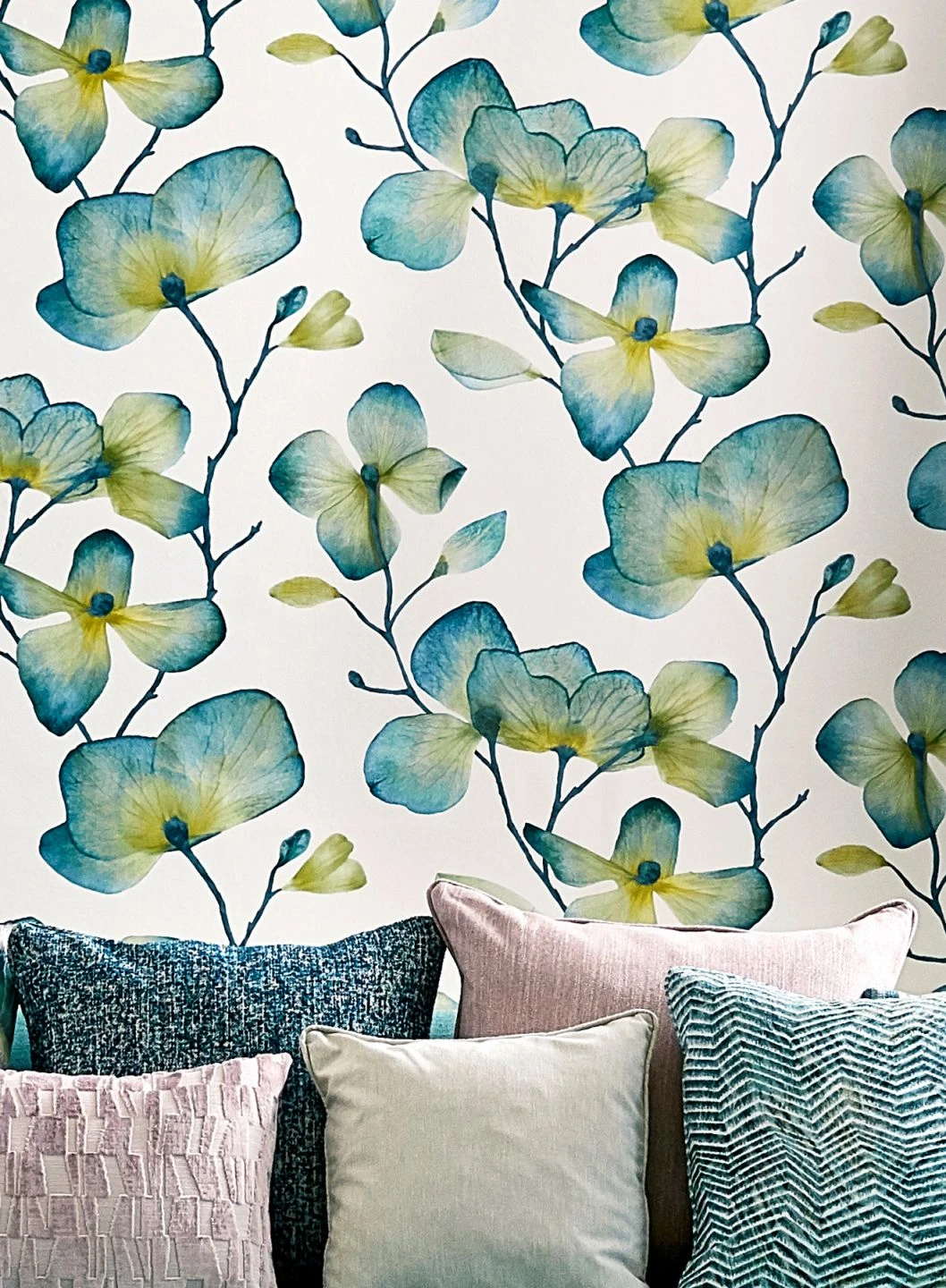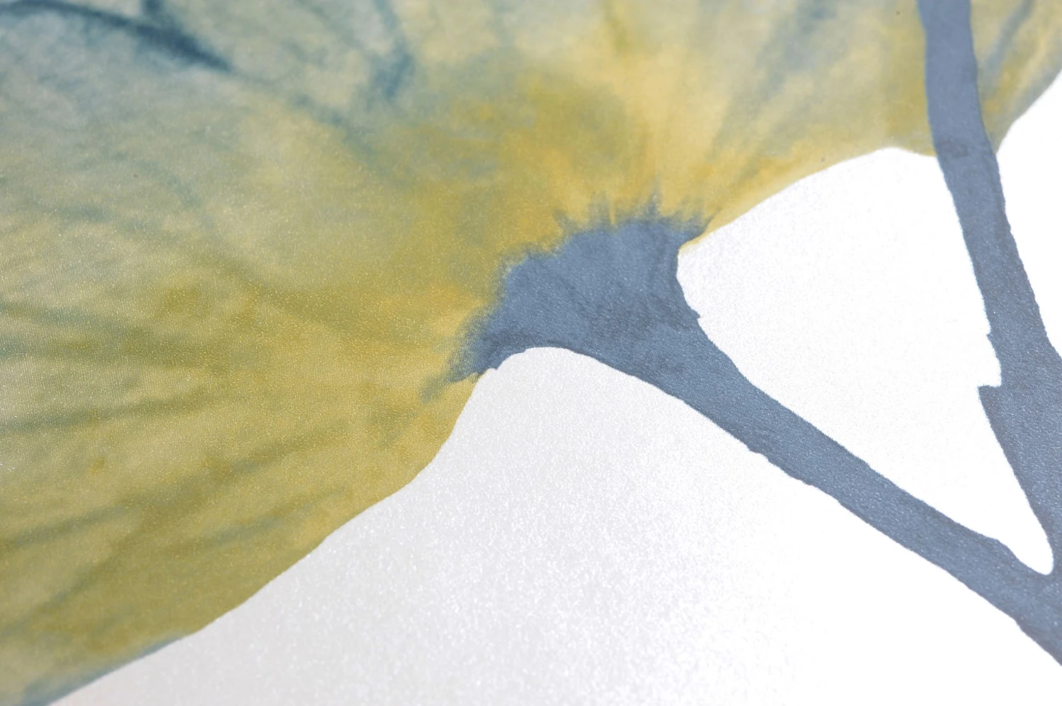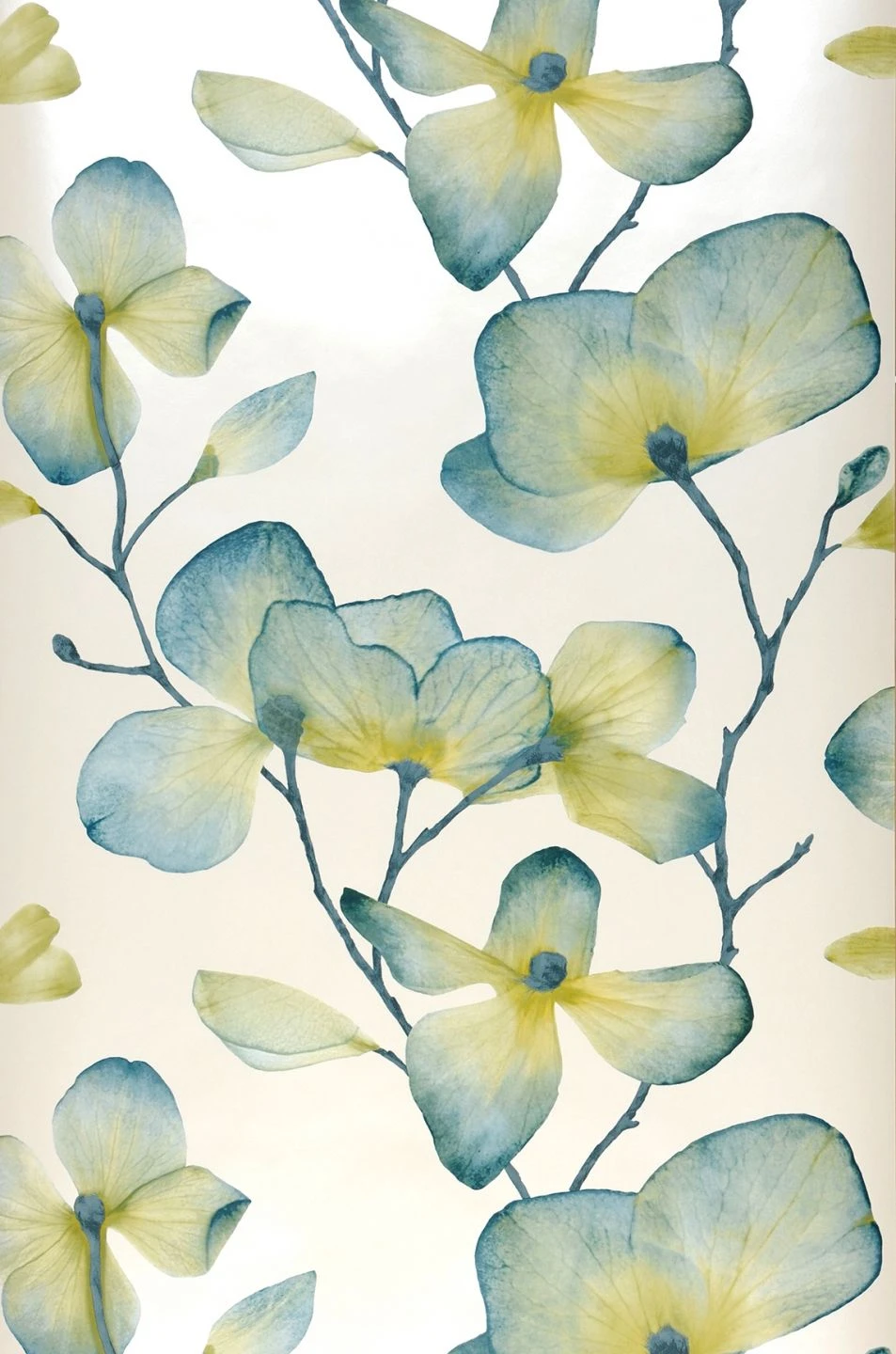 Fast durchscheinend wirken die großen Blüten an den blaugrünen Zweigen. Besonders attraktiv ist der aquarellartige Farbverlauf von Currygelb über Grünbeige bis hin zu Grünblau. Den Hintergrund bildet ein schimmerndes Cremeweiß. Insgesamt wirkt die Vliestapete leicht und luftig, die Blüten zart und verletzlich. Mit dieser Tapete machen Sie Ihr Wohnzimmer oder Ihr Schlafzimmer zu einem besonderen Ort.