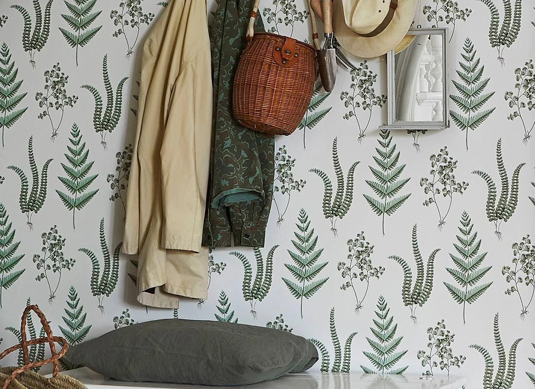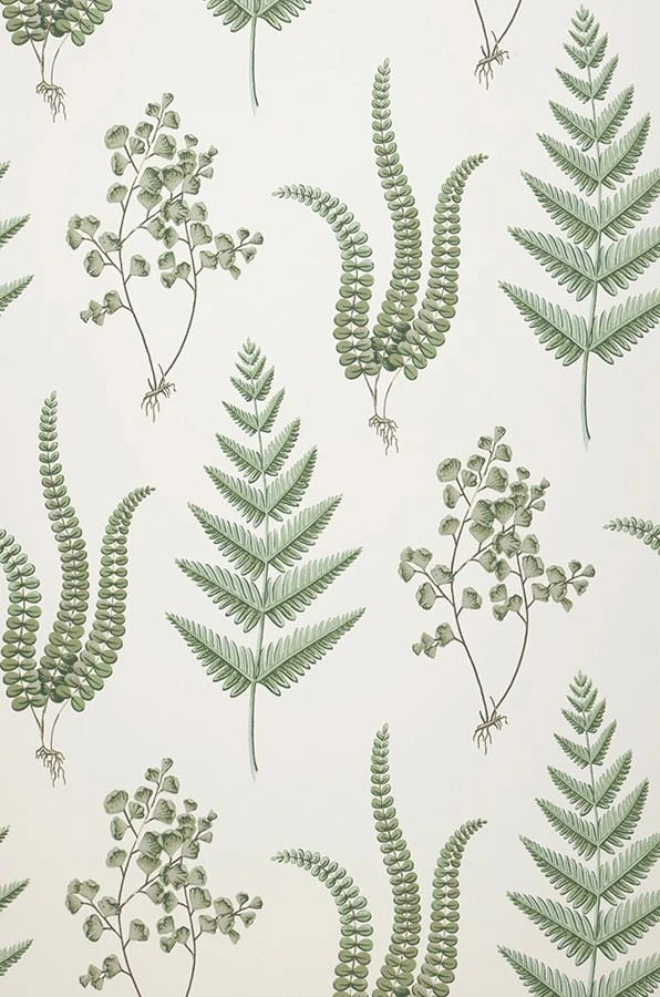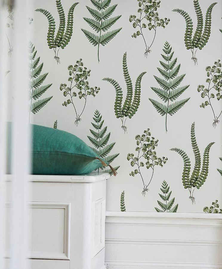 Farne mit ihren vielfältigen, filigranen Blattformen sind die Stars dieser Vliestapete. Auf dem cremeweißen Grund sind naturgetreu und detailliert verschiedene Farnarten abgebildet. Die verschiedenen Grüntöne ihrer Blätter zeigen wie die Abbildungen in einem botanischen Lehrbuch die verblüffende Feingliedrigkeit der Pflanzen und setzen der Formenvielfalt einen gemeinsamen Farbraum als verbindendes Element entgegen, der besonders Holztöne und Naturmaterialien perfekt ergänzt.