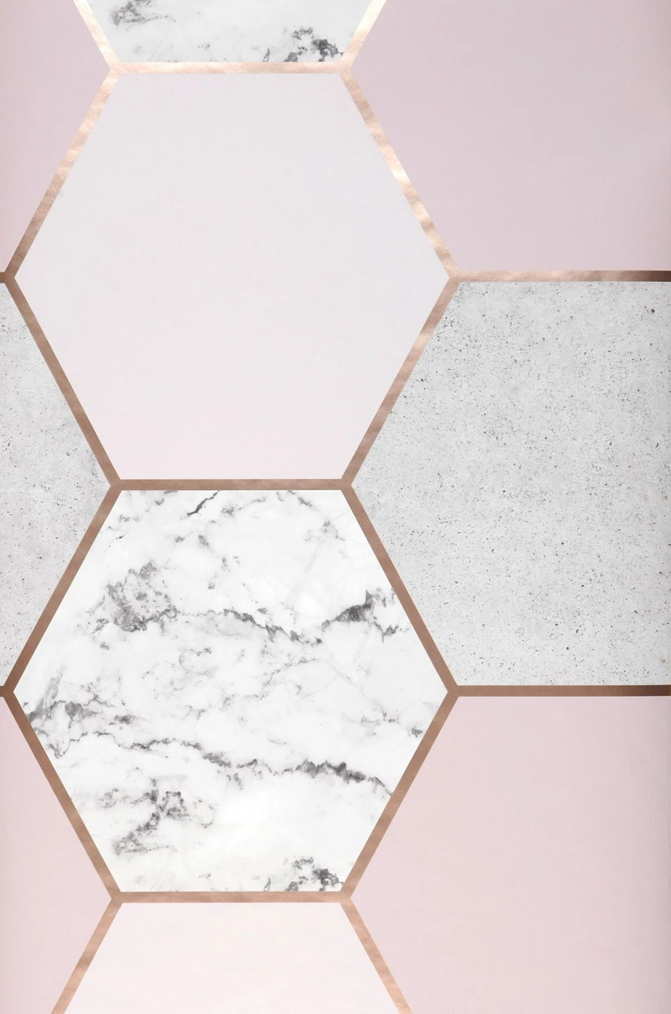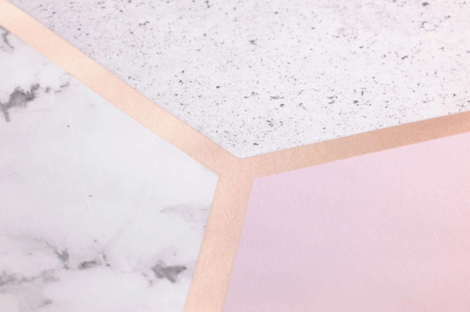 Naturstein und Geometrie finden hier gekonnt zueinander. Rosa Töne, Rosenholz Schimmer, weiße Marmor- und Granitoptik wechseln sich zauberhaft ab und lassen eine erweiterte Musterwirkung zu. Das unkonventionelle Muster mit leichter Retro-Note macht Fashionistas Spaß, die auch in Sachen Tapetendesign gerne mit der Mode gehen.