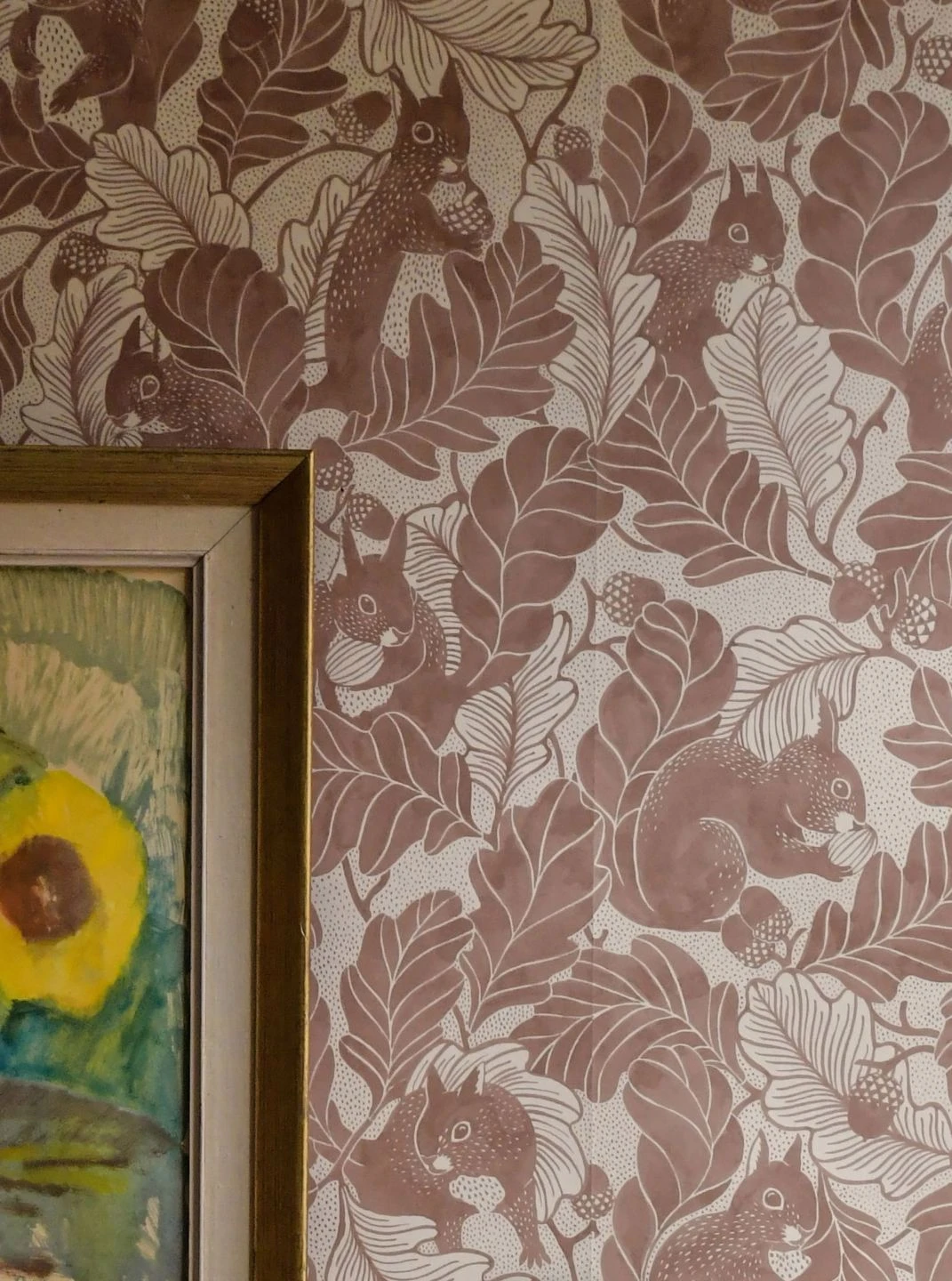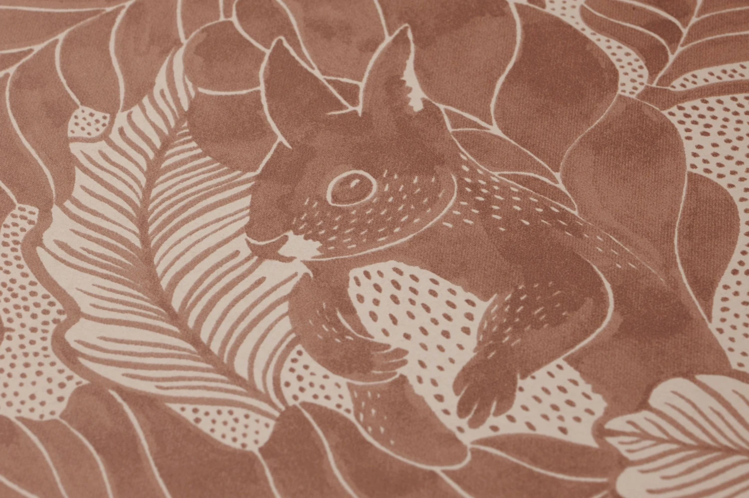 Perfekt getarnt sind die niedlichen Eichhörnchen zwischen üppigen stilisierten Eichenblättern. Denn ihre buschigen Schwänze sind von den geschwungenen Blättern nur zu unterscheiden, wenn man genau hinsieht! Das Spiel mit der Tarnung ist in einem sanften, warmen Blassrotbraun gehalten, das zum cremeweißen Grund wunderbar passt. Eine warmherzige Tapete, die einen Hauch von Vintage mitbringt und sich in jedem Zimmer gut macht.