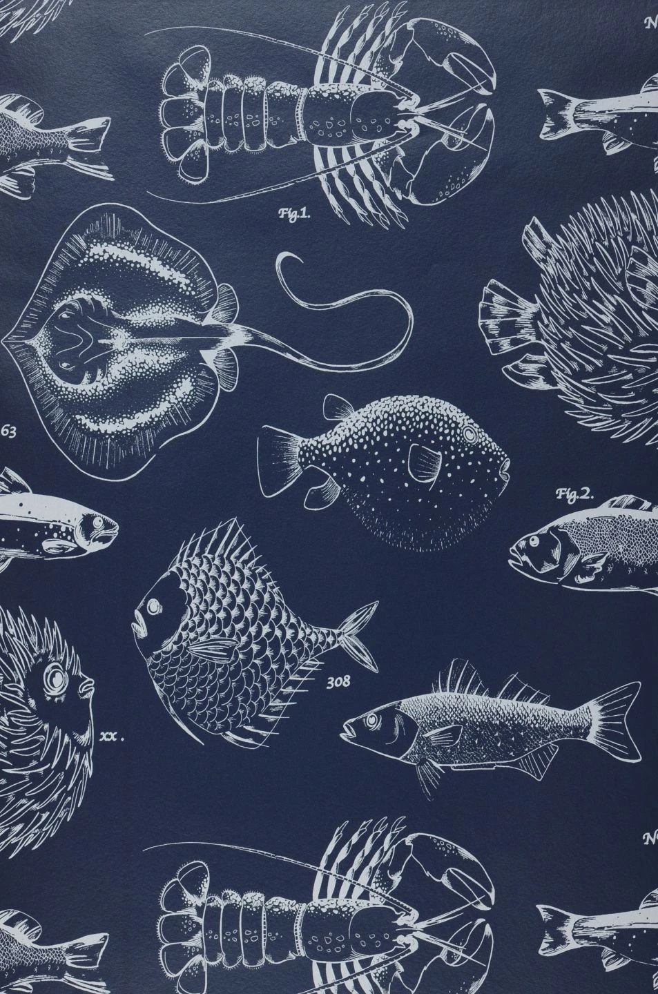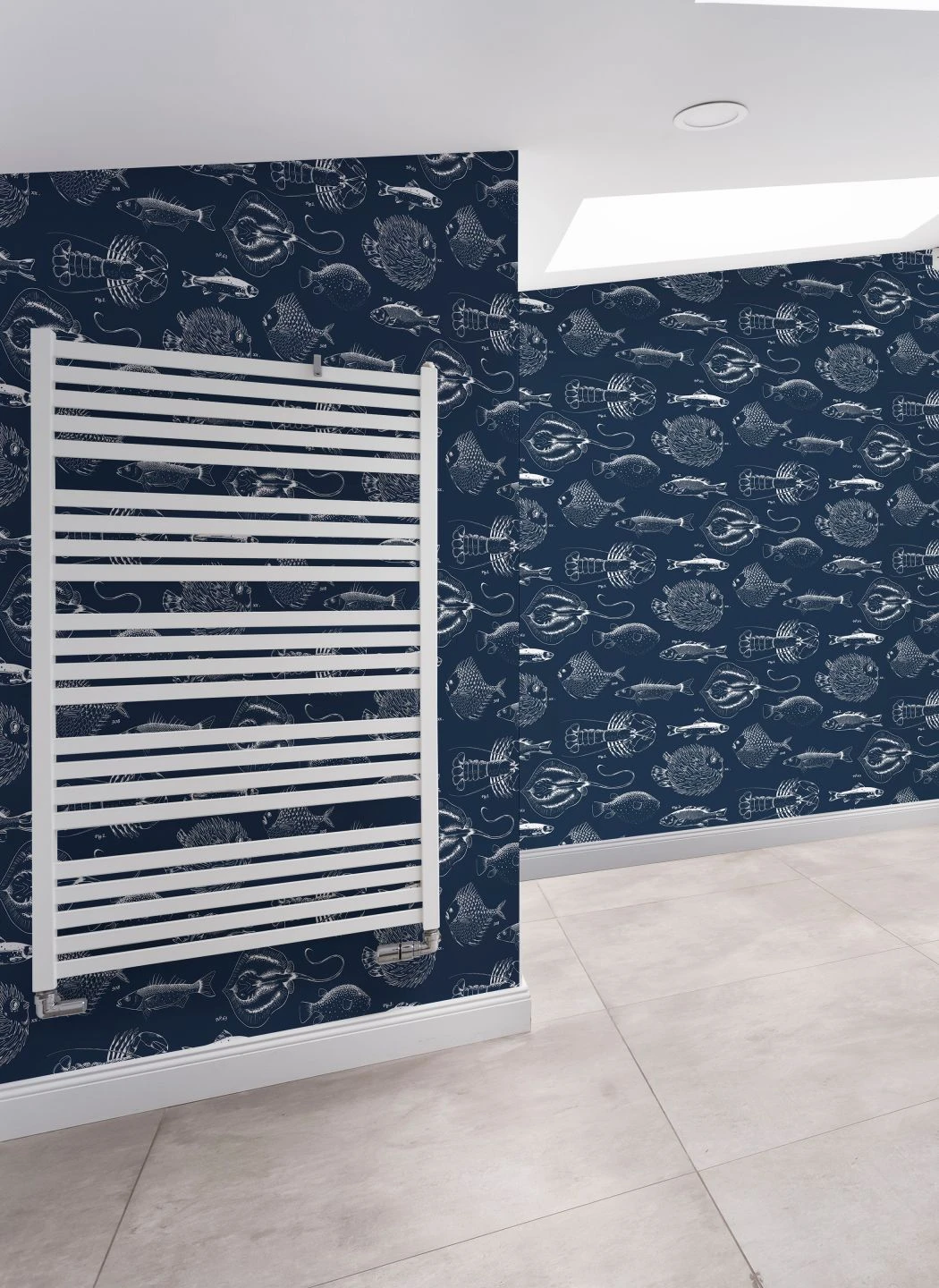 Alle erdenklichen Fische und Meerestiere sorgen hier für maritime Atmosphäre! Die detaillierten und naturgetreuen Zeichnungen lassen jede Einzelheit der verschiedenen Arten erkennen. Kühle Frische strahlt die Farbkombination von Weiß auf dunkelblauem Grund aus. Durch das als Oberflächenmaterial verwendete hoch waschbeständige Vinyl können Sie mit „Oceano“ selbst Ihrem Badezimmer problemlos einen perfekten maritimen Touch verleihen.