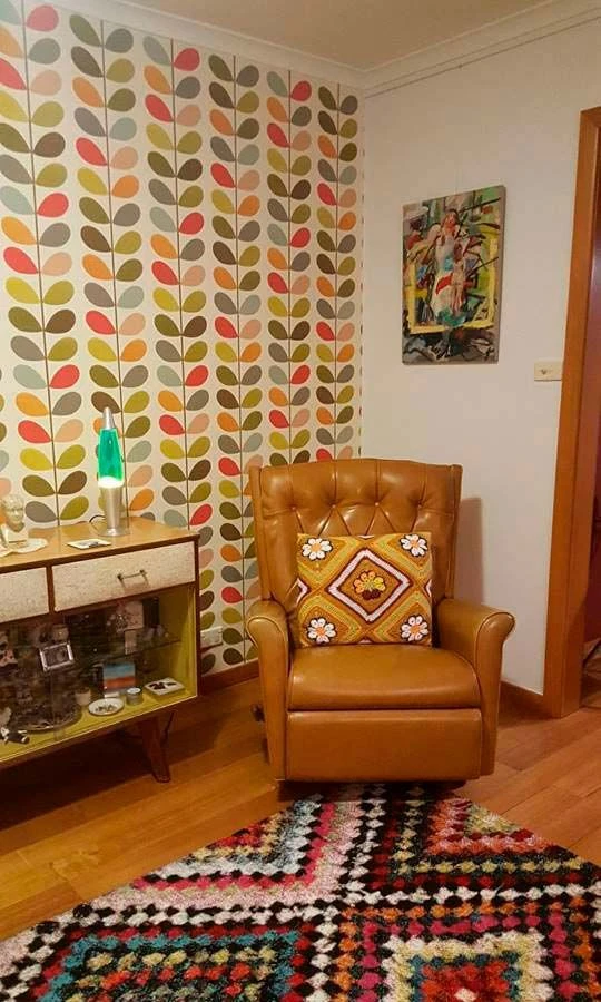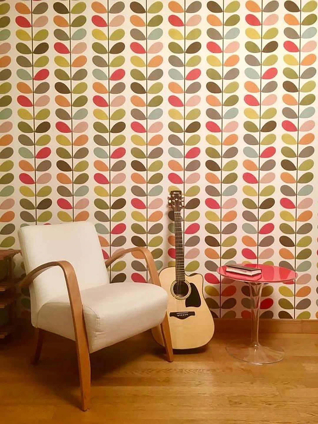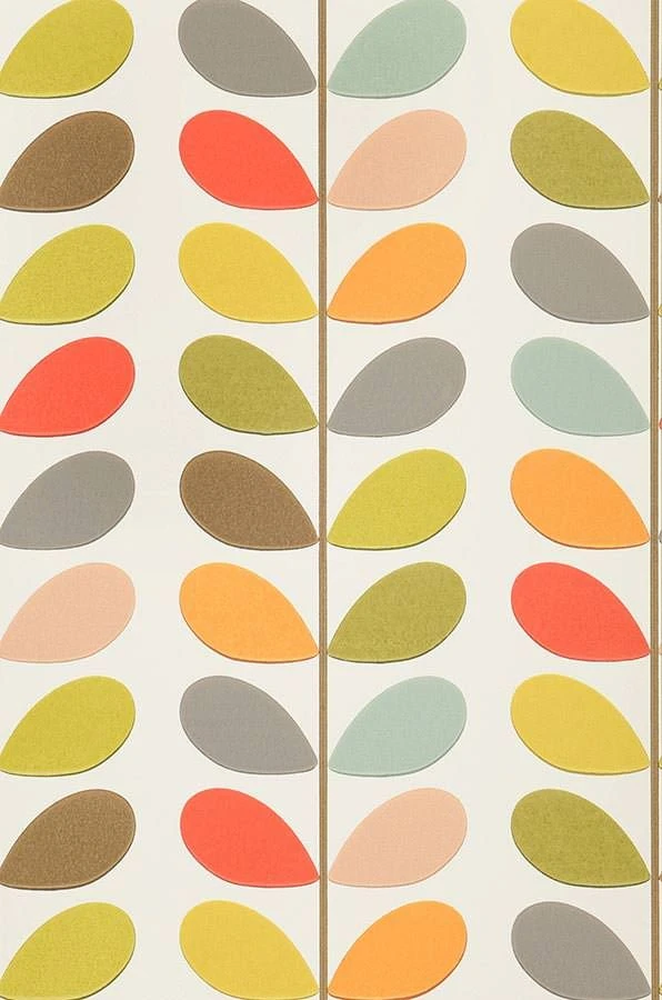 Stilisierte Blattranken in hellen, freundlichen Farben strahlen fröhlichen Retro-Charme aus. Die irische Designerin Orla Kiely ist bekannt für ihre charaktervollen, stilisierten Blüten- und Blattdesigns im Stil der 70er Jahre. Die bunten Farben auf cremeweißem Grund, ein herrliches Gegengewicht zur symmetrischen Anordnung der Ranken, schicken Ihren Raum auf eine ganz individuelle Zeitreise und vertragen sich bestens mit farblich passenden Möbeln aus den 70er Jahren.