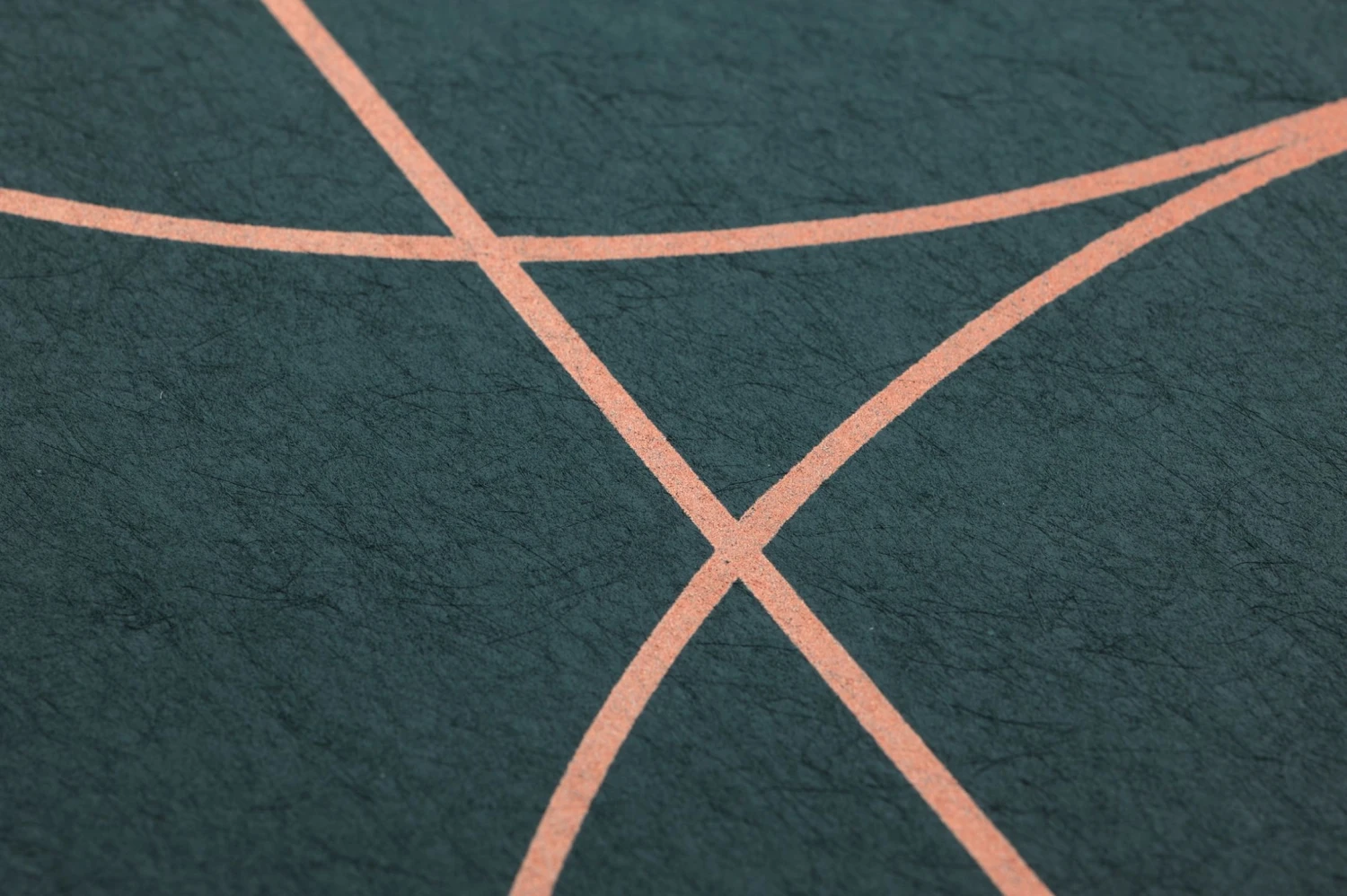 Klare, feine Ornamente in schimmerndem Roségold bereichern das tiefe, ruhige Kieferngrün des Untergrunds. Die Vliestapete mit ihrem zarten geometrischen Muster im Stil des Art Deco verleiht Ihren Räumlichkeiten einen unverwechselbaren Charakter. Warme rötliche Holztöne, Möbel im Retro-Stil oder auch eine passende Wandfarbe runden den Gesamteindruck ab und schaffen ein stilvolles Ambiente.