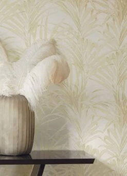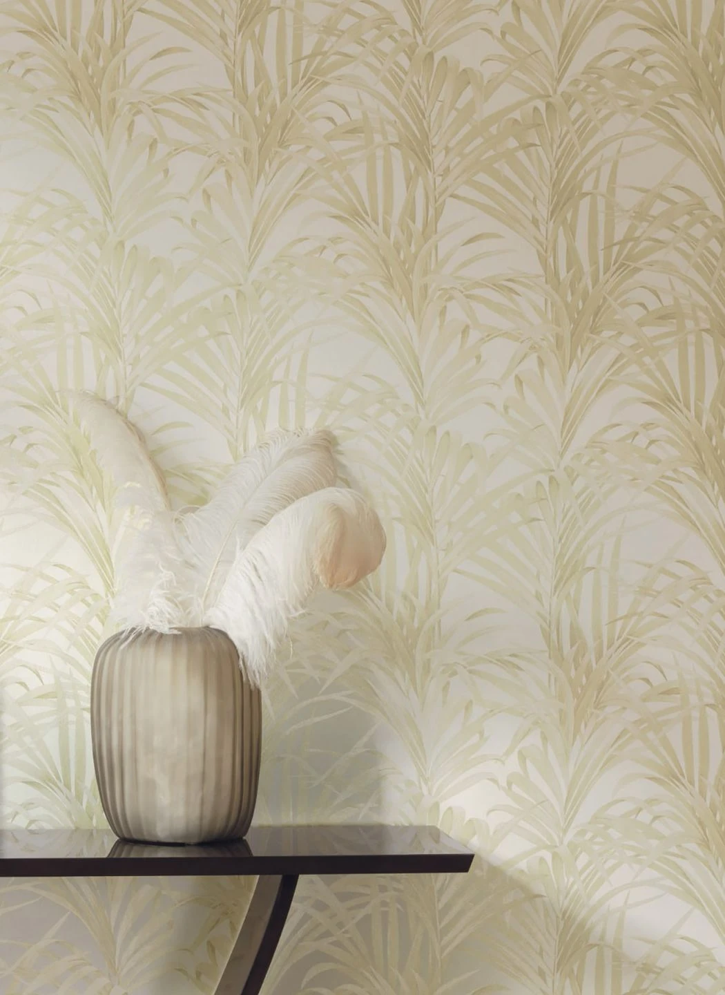 Besonders zart und elegant wirken die schlanken Palmenblätter in einem fein glänzenden Cremeton mit perlgoldfarbenen Akzenten auf dem cremeweißen Untergrund. Lichtdurchflutet und leicht ist der Eindruck, den die edle Vliestapete in Ihrem Raum entstehen lässt. Ton in Ton kombiniert mit weiteren hellen Einrichtungselementen, aber auch mit dunklen Holztönen, macht sie Ihren Raum unverwechselbar.