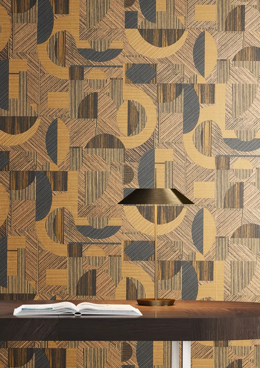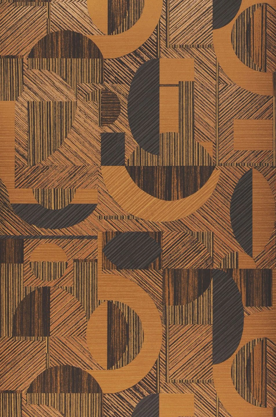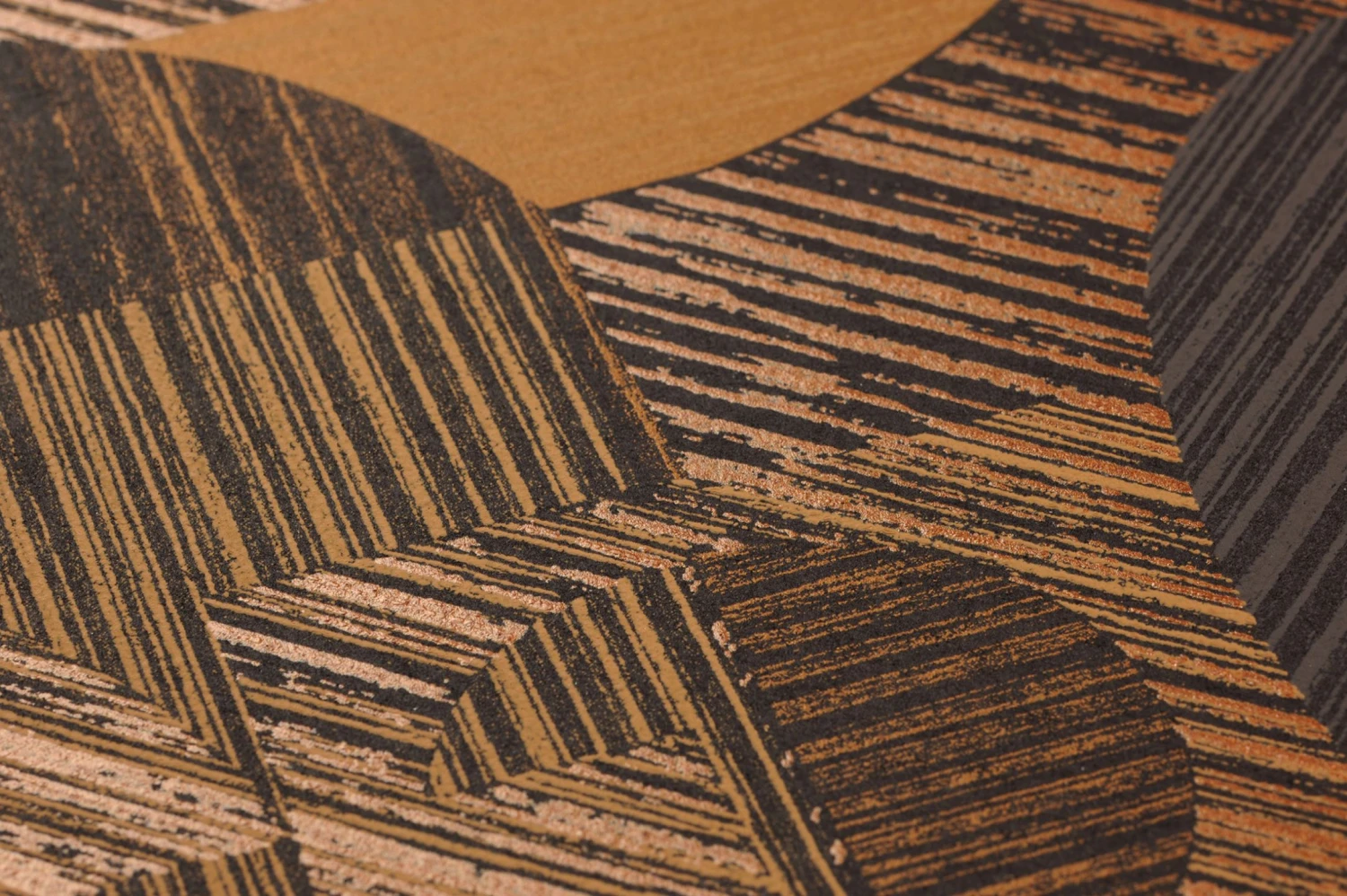 Die abstrakten geometrischen Formen erhalten durch die Schraffur mit schimmerndem Beigebraun und Bronze eine Optik, die an die Maserungen von naturbelassenem Holz erinnert. Eine warme Atmosphäre, wie sie von holzvertäfelten Wänden ausgeht, steuert auch die Farbgebung in Beige-, Braun- und Bronzetönen bei. Hier verbindet sich Gemütlichkeit mit modernem Design zu einem ganz eigenen Stil.