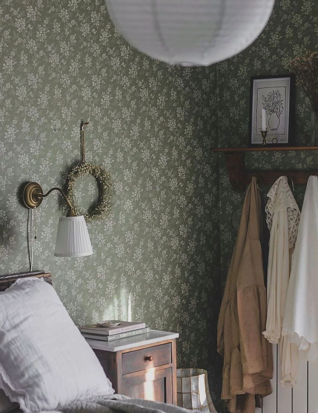 Cremeweiße Blüten und Blattranken auf schilfgrünem, mit feinen Punkten dekoriertem Grund verströmen ihren Vintage-Charme. Die zarten Blüten und filigranen Zweige passen ebenso gut in ein gemütliches Wohnzimmer wie ein Schlafzimmer oder eine Küche. Besonders antike Möbel kommen in Kombination mit der Vliestapete Patricia wunderbar zur Geltung. Alle Holztöne ergänzen das Schilfgrün vorteilhaft.