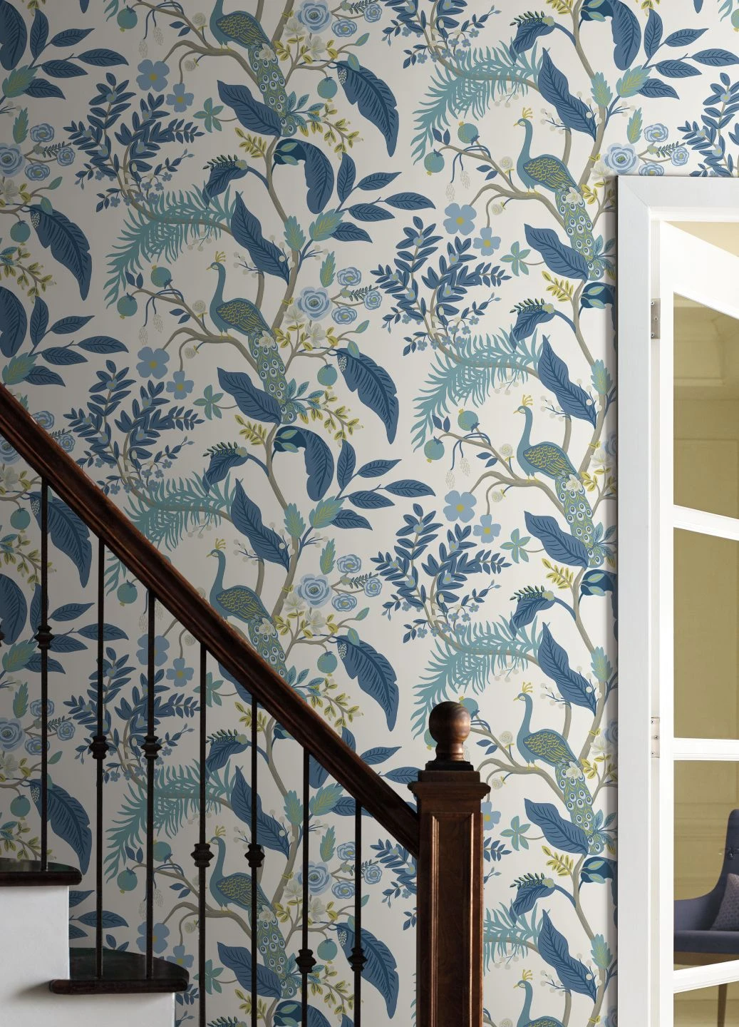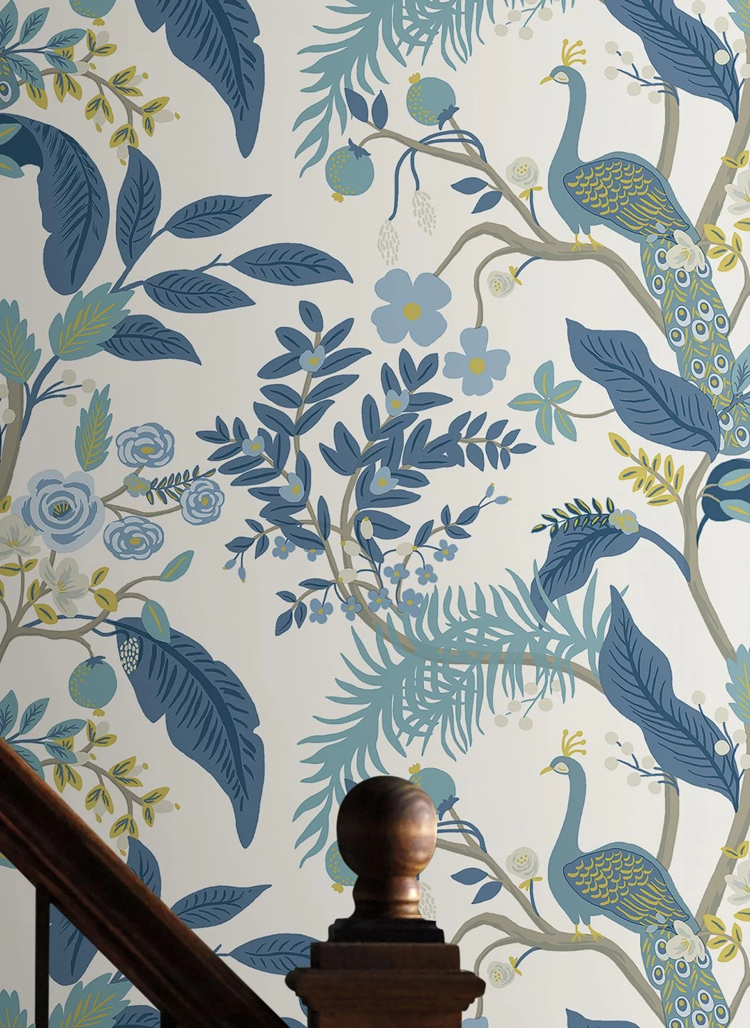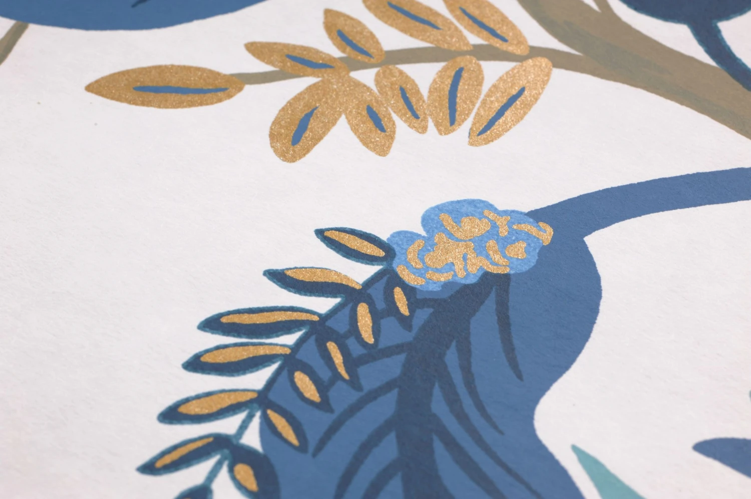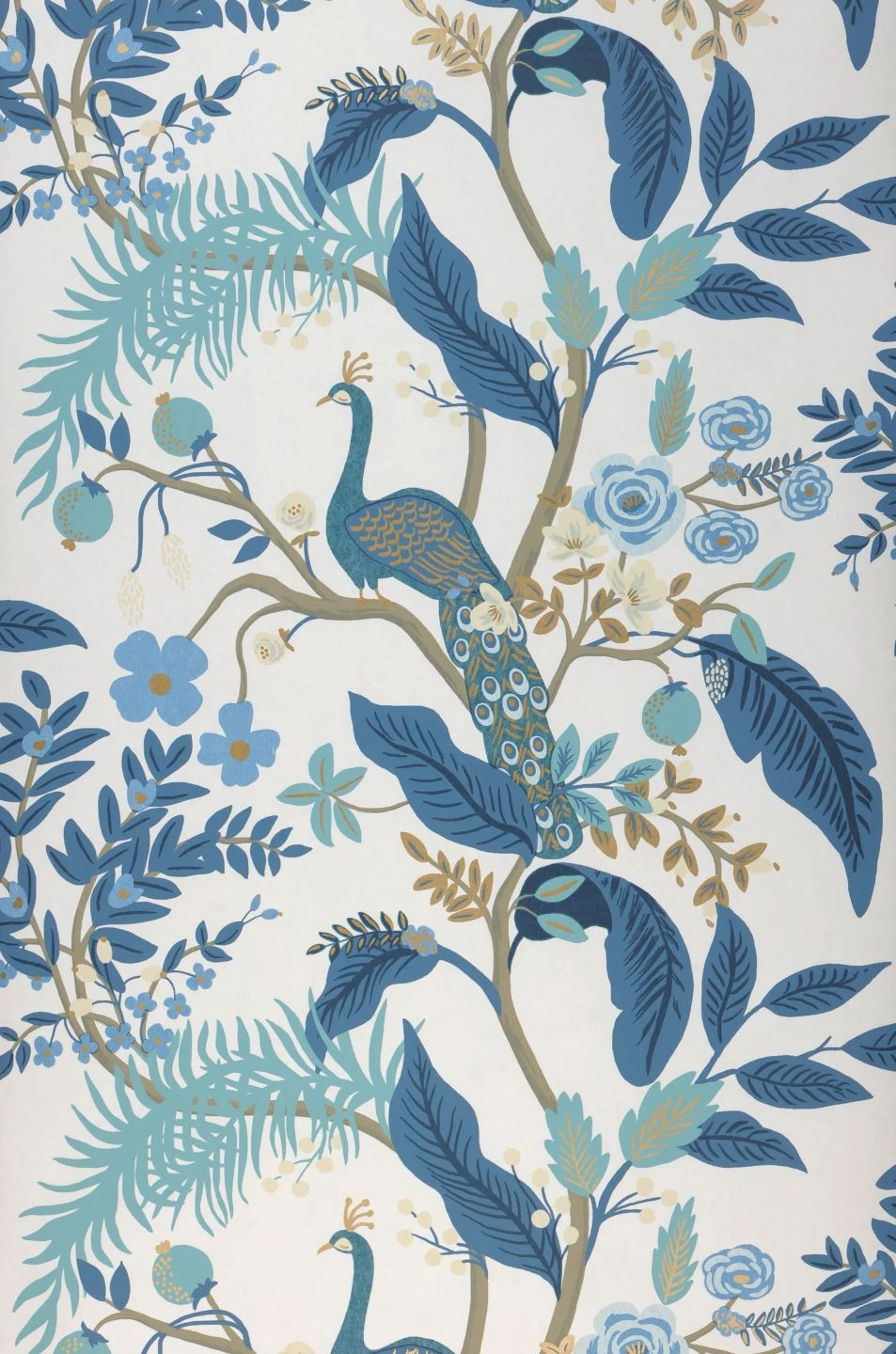 Im unverkennbaren, handgemalten Stil von Rifle Paper entsteht an Ihren Wänden eine ganze märchenhafte Tropenwelt. Zwischen Blattranken, Blüten und Früchten sitzen exotische Pfauen mit ihren prachtvollen Schwanzfedern. Die sanften Blautöne, die auf dem weißen Grund besonders schön zur Geltung kommen, verströmen eine Atmosphäre der Ruhe und Entspannung. Akzente aus schimmerndem Perlgold, die die Gestalt der Blätter und Blüten betonen, liefern schimmernde Schlaglichter.