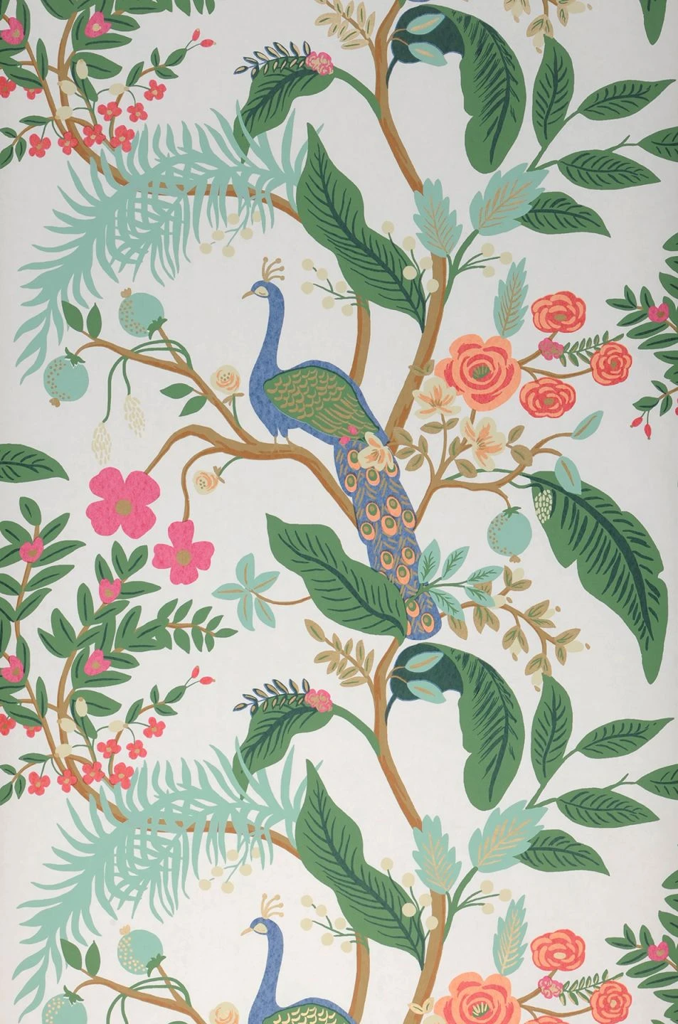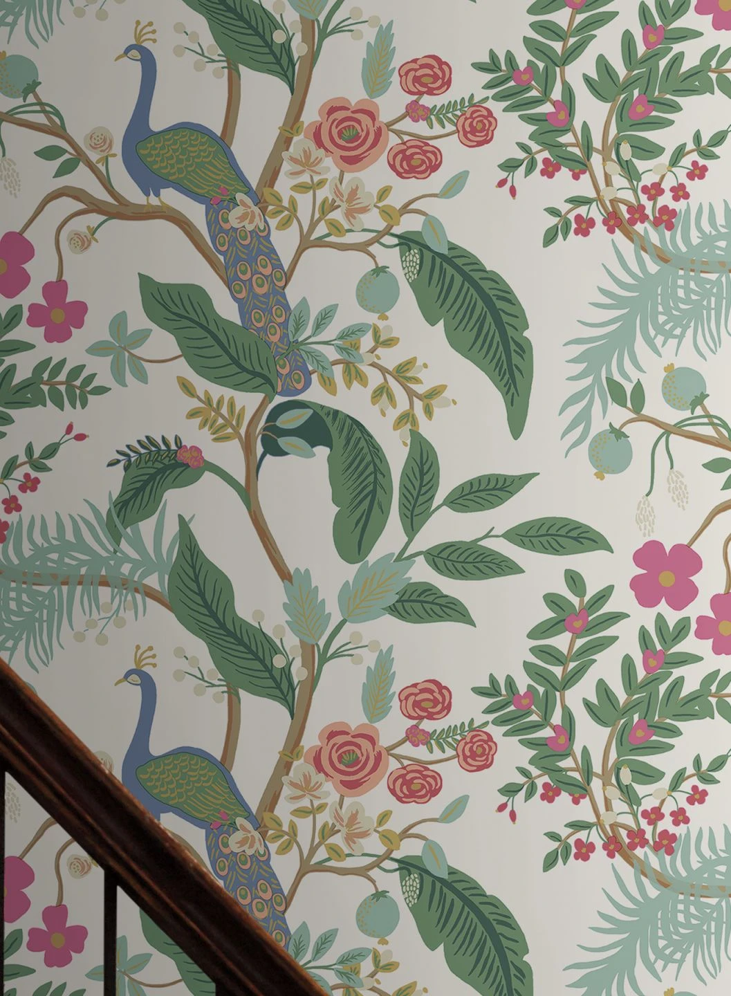Ein tropisches Paradies mit üppigen Pflanzen in verschiedenen Grüntönen und bunten Blüten sorgt für Urlaubsstimmung. Dazwischen thronen prächtige Pfauen mit ihren beeindruckenden Schwanzfedern. Die farbenfrohe Vliestapete fasziniert mit liebevoll gemalten Details und goldfarbenen Lichtreflexen und passt zu einer Vielzahl von Einrichtungsfarben und Stilen. In jedem Fall zaubert sie gute Laune an die Wände!