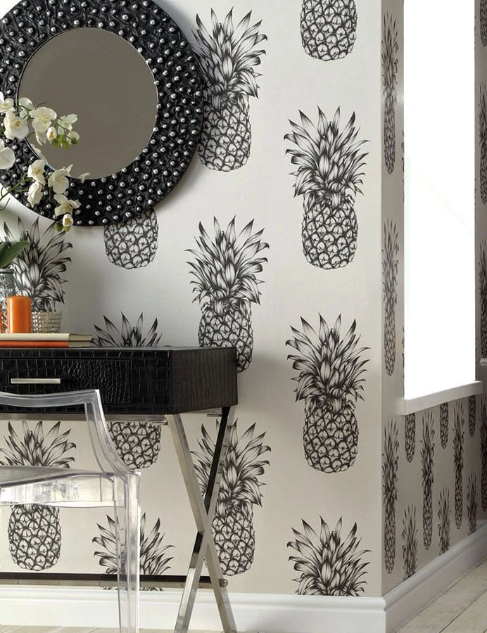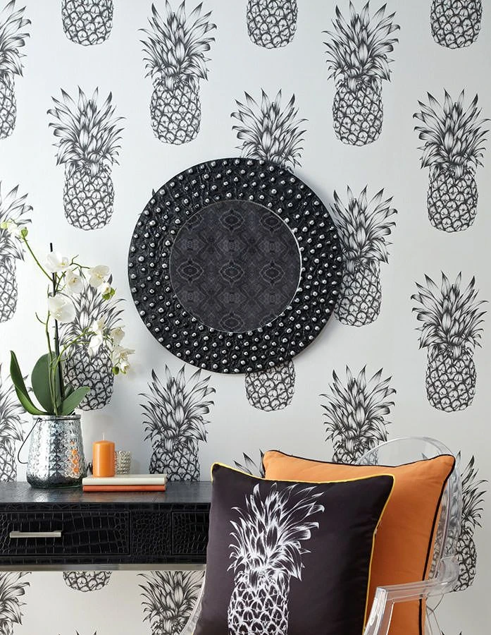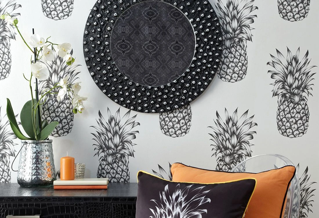 Alles Ananas – Die Tropenfrucht mit unwiderstehlichem Geschmack lässt auch an der Wand das Wasser im Munde zusammenlaufen. Im Stil detailgetreuer Grafikzeichnung und mit versetzter Musteranordnung erhält die ausgefallene Tapete ihre künstlerische Note. In puristisch modernen Wohnstilen setzt sie klaren Strukturen die fruchtige Krone auf.