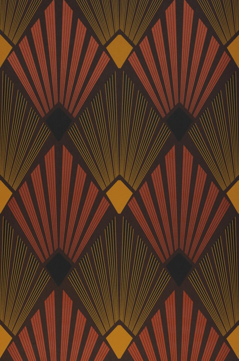 Intensive, warme Erdfarben betonen das markante Art-Deco-Design von Vliestapete Pontinius. Der Kontrast zwischen dem kräftigen Perlkupfer, dem dunklen Schwarz und Sepiabraun und dem prägnanten Ginstergelb unterstützt den dynamischen, beinahe plastischen Eindruck des Musters aus aufgefächerten Strahlen. Charaktervolle Retro-Möbel in einer der Musterfarben gehen eine reizvolle Verbindung mit der Tapete ein und nehmen Sie mit auf eine Zeitreise.