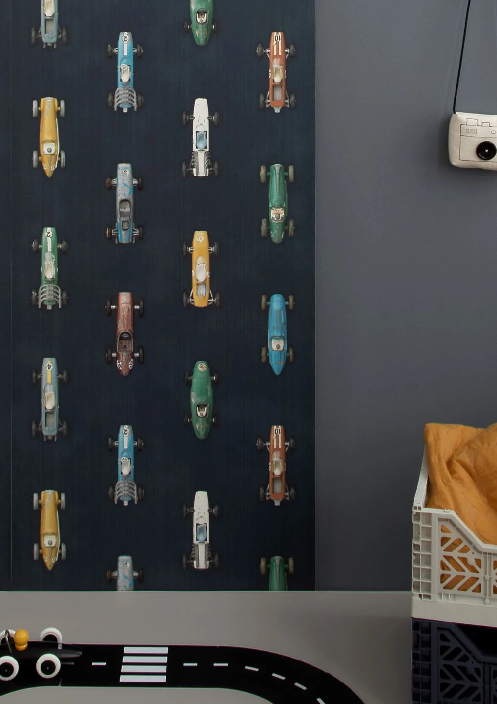 Täuschend echt begeistert das Mustermotiv mit Rennautos der frühen Generation auf schwarzem Asphalt. Man kann praktisch die Reifen quietschen hören, wenn sie ihre Runden drehen. Das Designerstück der niederländischen Manufaktur Studio Ditte lässt die Herzen von jungen und junggebliebenen Rennsportfans höher schlagen.