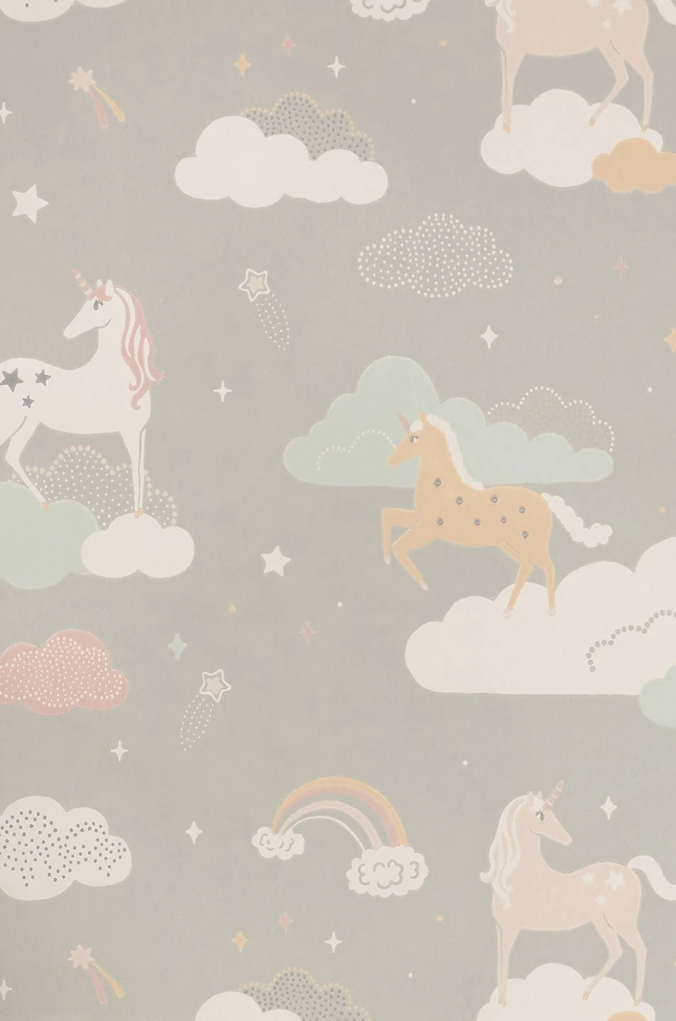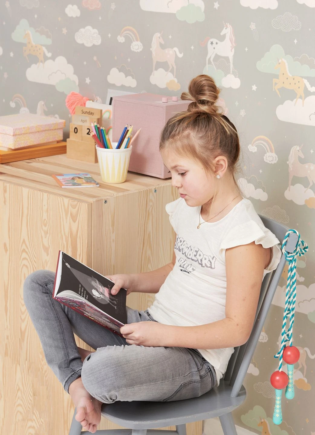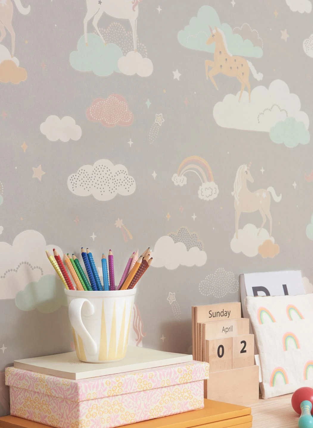 Auf eine phantastische Reise über die Wolken, wo Einhörner leben und Sterne zwischen Regenbögen funkeln, nimmt diese Vliestapete Ihr Kind mit. Das klare, helle Design spricht die kindliche Phantasie an und weckt die Kreativität. Nicht umsonst ist Majvillan bekannt für seine Kinderzimmer-Tapeten! Die hellen Farben auf dem moosgrauen Grund drängen sich nicht in den Vordergrund, sondern bilden eine traumhafte Kulisse voller Anregungen.