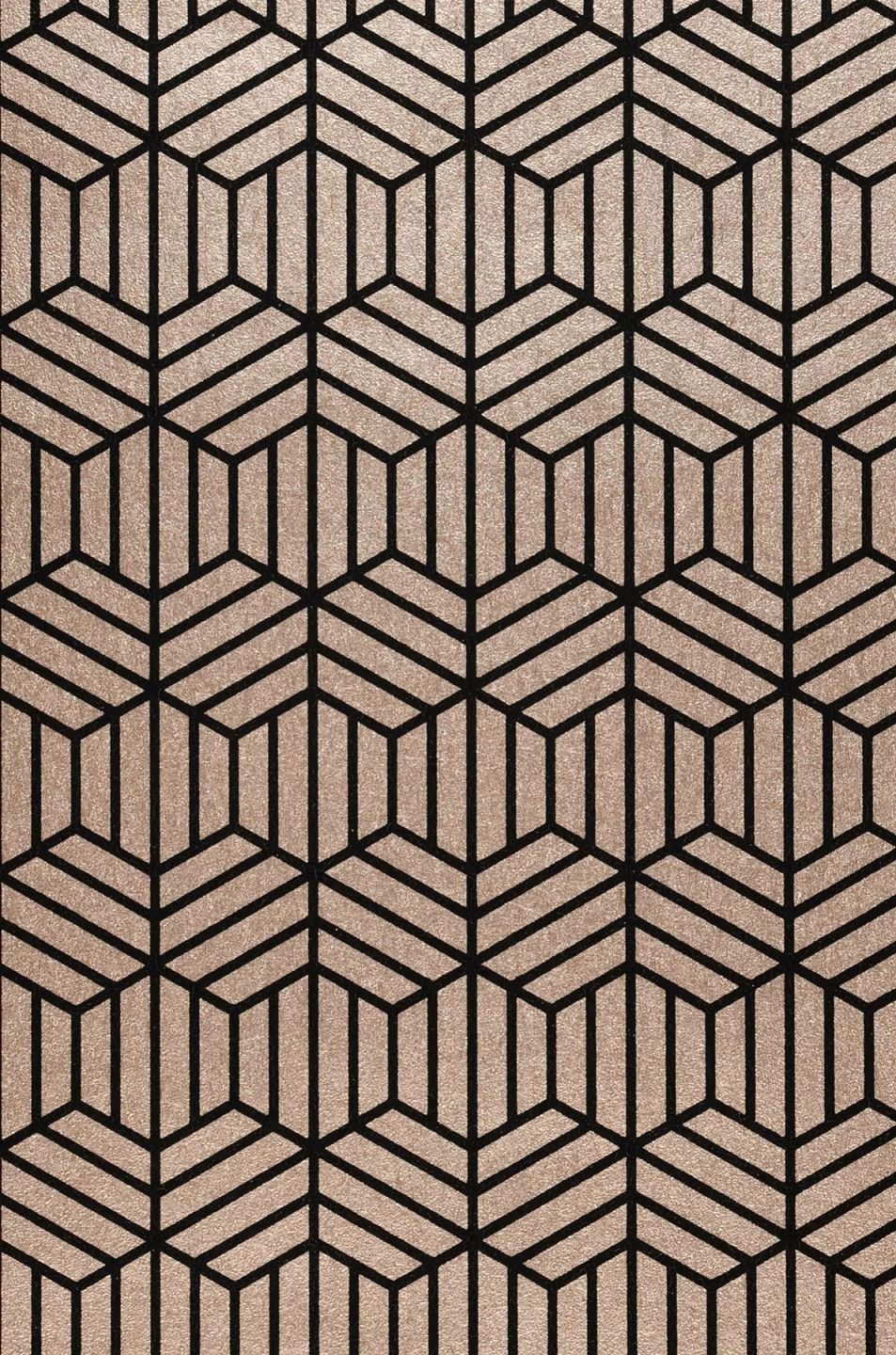 Glitterndes Rosenholz setzt die quer und längs verlaufenden Hexagone in ein kupferglänzendes Licht. Das schwarze, verspielte Geometriemuster liebt die Abwechslung und ist ein Eyecatcher für Gestaltungsideen, die Vintage und Moderne verbinden. Es bietet dem Auge Struktur und glanzvolle Blickpunkte.