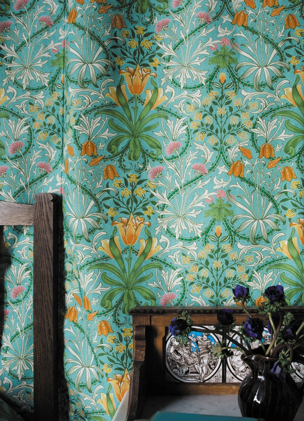 Tulpen, Glockenblumen und viele Blüten mehr in lebhaften Rosa- und Orangetönen, ausladend geschwungene Dornenranken und filigrane Blätter hat der britische Designer John Henry Dearle in seinem Tapetenmuster vom Anfang des 20. Jahrhunderts vereint. Die im Leimdruckverfahren gefertigte Papiertapete aus dem Hause Morris & Co. mit den frühlingshaften Farben auf leuchtend pastelltürkisfarbenem Grund bietet einen perfekten Hintergrund für antike Möbel.