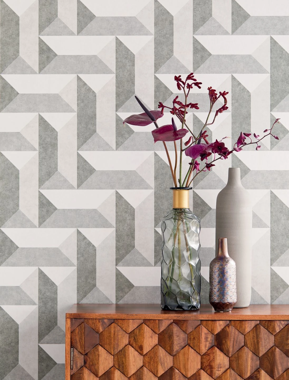 Treppenförmige Geometrie lässt die Wand unendlich erscheinen. Grautöne und Weiß bieten jede Menge Freiraum in der Inneneinrichtung. Schmale und kleine Räume erhalten großzügige Weite. Die formbeständige und waschbeständige Vliestapete eröffnet durch das plastische Muster auch kunstvolle Gestaltungsmöglichkeiten im Eingangsbereich.