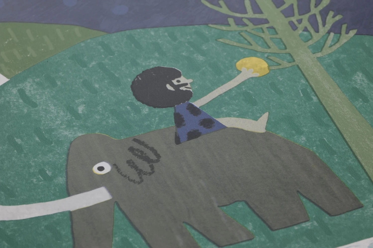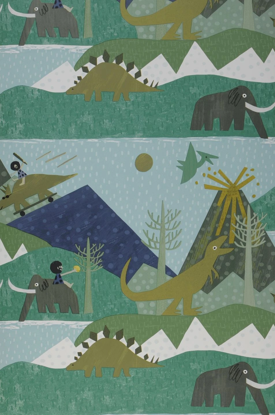 Hat man eigentlich schon herausgefunden, warum Kinder Dinosaurier so mögen? Hier jedenfalls stehen die Urzeit-Echsen ganz im Mittelpunkt. In einer collagenartig angelegten Urzeitlandschaft mit Bergen, Bäumen und Vulkanen leben sie friedlich Seite an Seite mit Mammuts und Höhlenmenschen. Mit einem großen Augenzwinkern blickt die Tapete weit in die Vergangenheit und bietet eine tolle Kulisse für Spiel und Spaß.