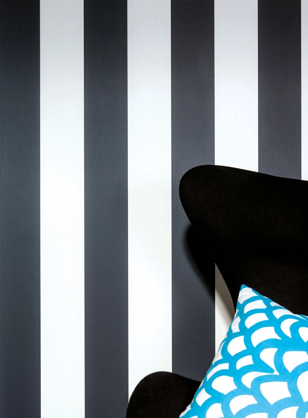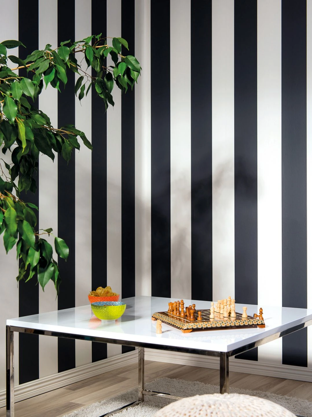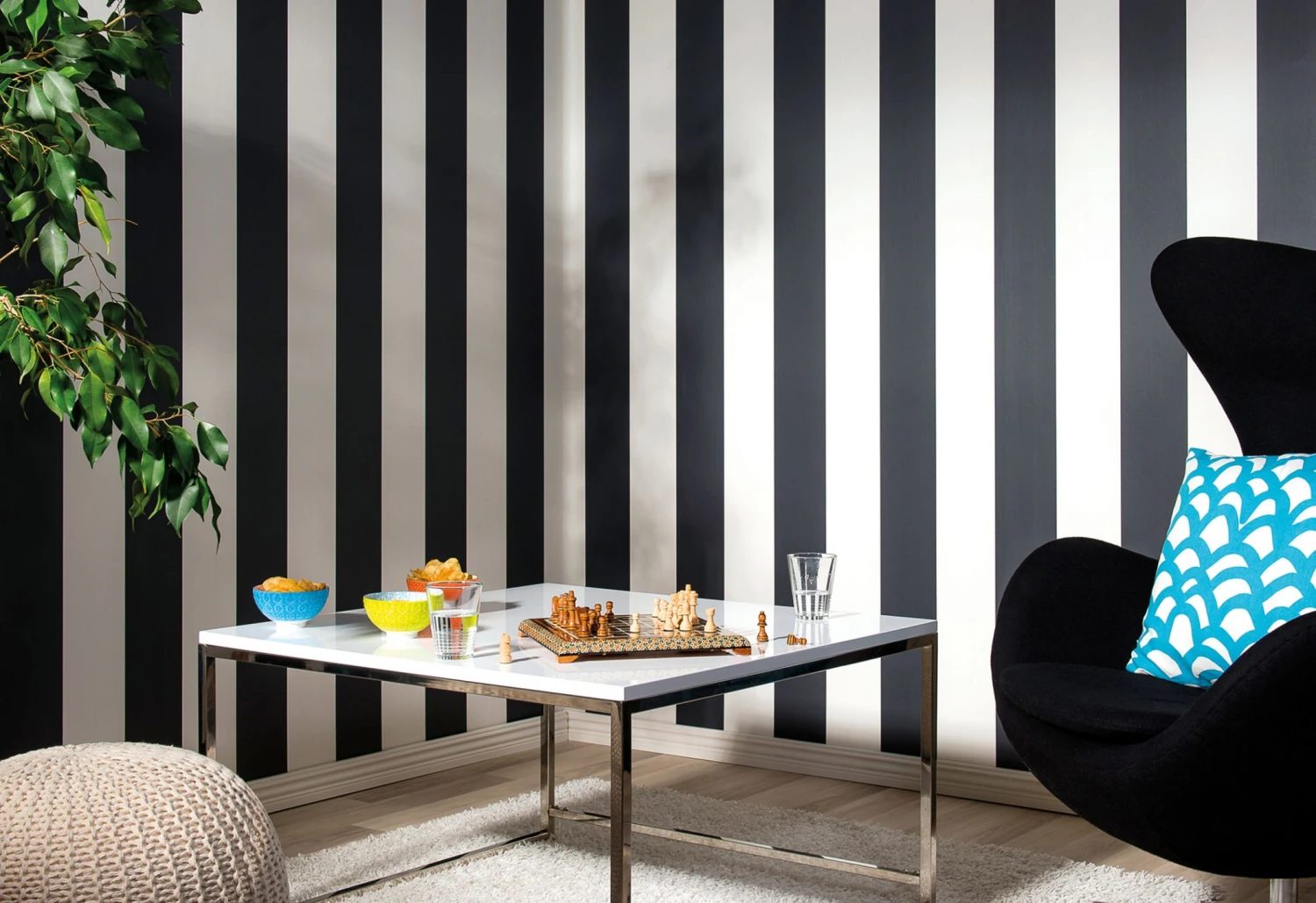 Ein Klassiker der Moderne präsentiert sich mit der schwarz-weißen Streifentapete, deren unkonventionelle und experimentelle Eleganz schon in den stylischen Sixties gefragt war. Gegensätze ziehen sich an, was sich auch am Mix von Möbelmaterialien und Möbelformen zeigen kann. Alles, nur nicht gewöhnlich, lautet hier die Devise.