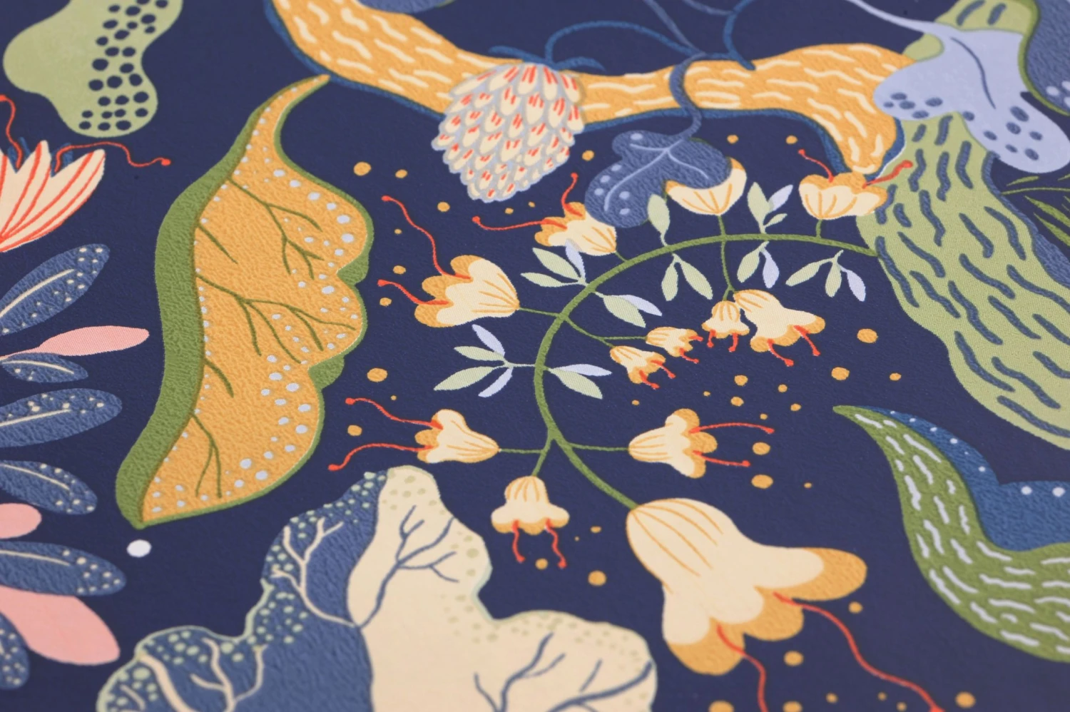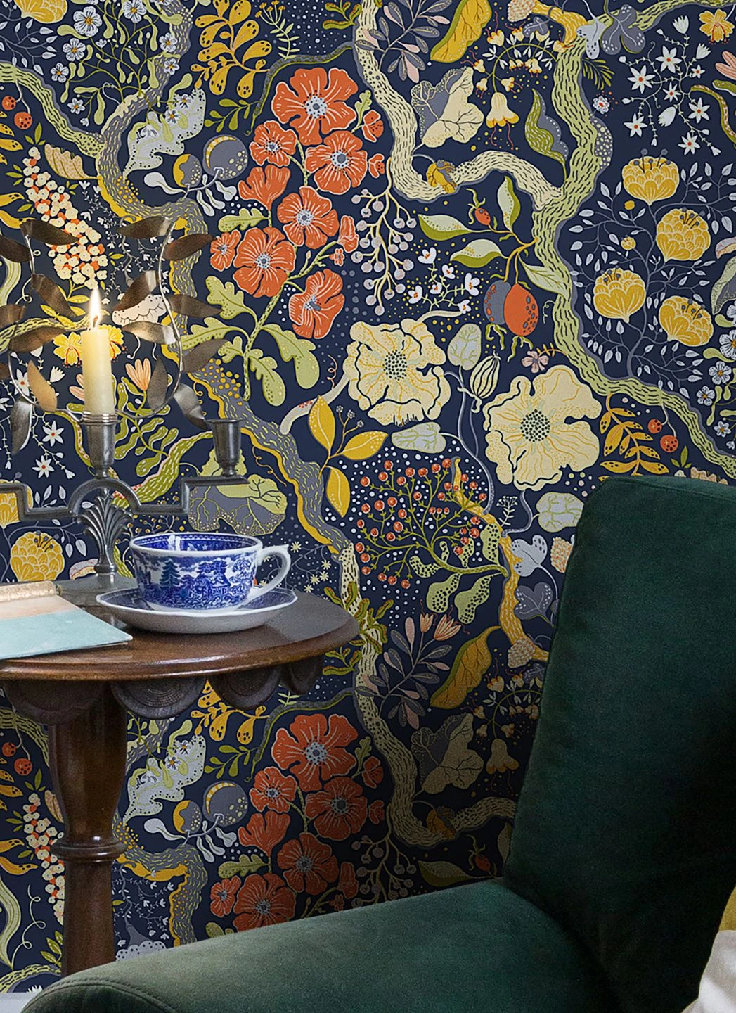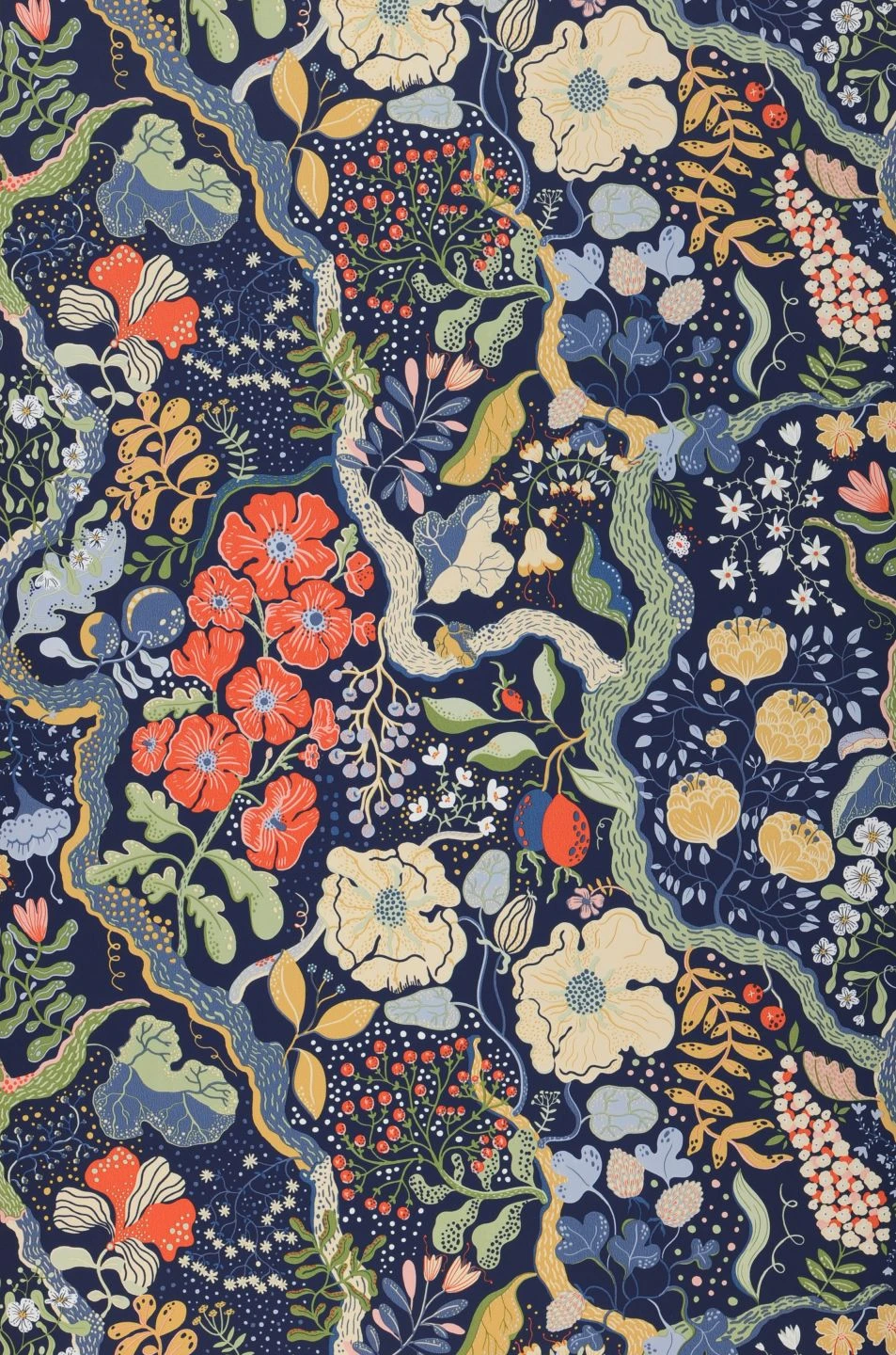 Expressiv und ausdrucksstark, in einer schier endlosen Vielfalt von Größe und Form, füllen Blüten und Zweige, Blätter und Beeren die Fläche der Tapete Rosanna fast vollständig aus. Die ganze Fülle des pflanzlichen Lebens von kraftvollen, knorrigen Ästen bis hin zu zarten weißen Blüten und zierlichen hellblauen Blättchen ist hier abgebildet. Wie in einem schönen Traum erschafft der dunkelblaue Untergrund einen Zusammenhalt und gleichzeitig eine fast magische Atmosphäre.