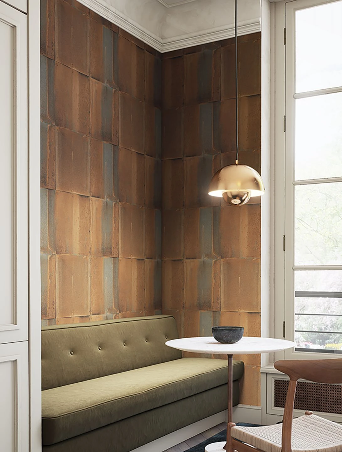 Perfekt für den Industrial Look oder den Loft-Style zeigt sich die geometrische Mustertapete in Braun, Orangebraun und Pastellblau. Die Farben zaubern den authentischen Look von mattem, in die Jahre gekommenem Metall. Die gewollte Unregelmäßigkeit der Elemente verstärkt den rauen Effekt.