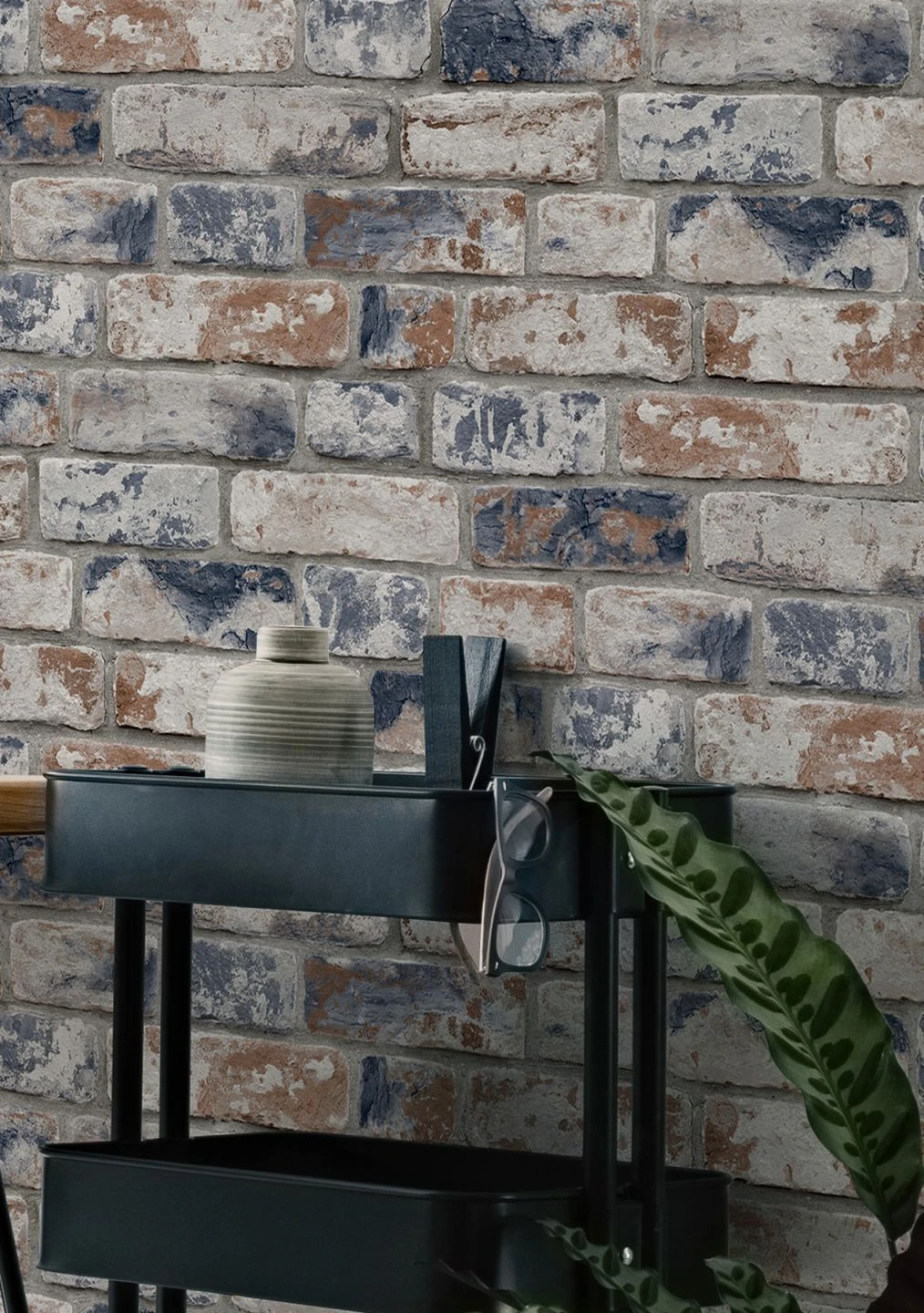 Backsteinoptik in Perfektion bietet die Steinoptik-Tapete „Sabal“: Wie Farbschichten verschiedenen Alters wechseln sich Bereiche in Blaugrau, Grau, Grauweiß und Kupferbraun ab und geben der Papiertapete ihren unverwechselbaren Charakter. Die sich perfekt ergänzenden Farben bereichern Industrial Chic oder Shabby Chic mit dem rauen und gleichzeitig warmen Charme von Backsteinmauern historischer Industriegebäude.