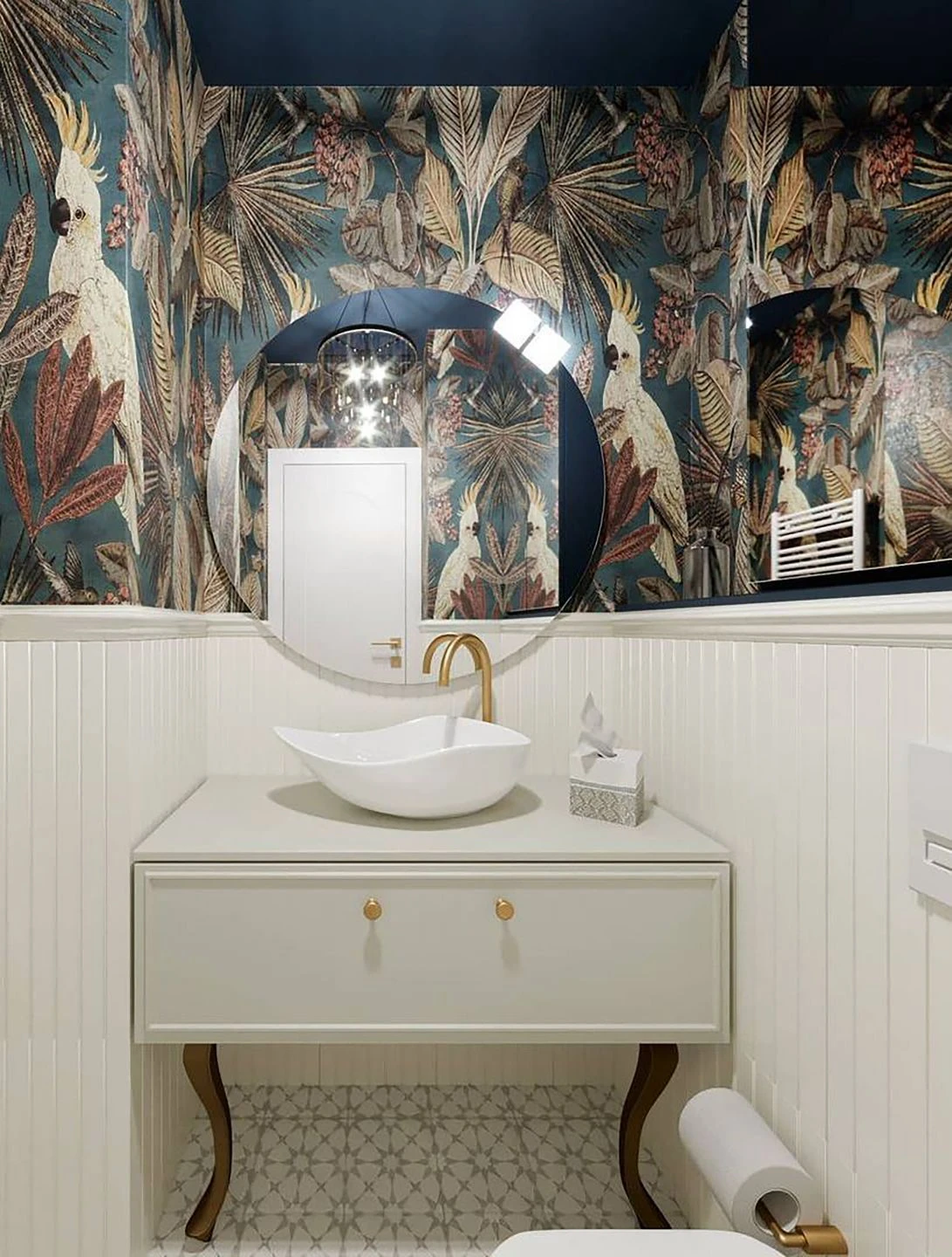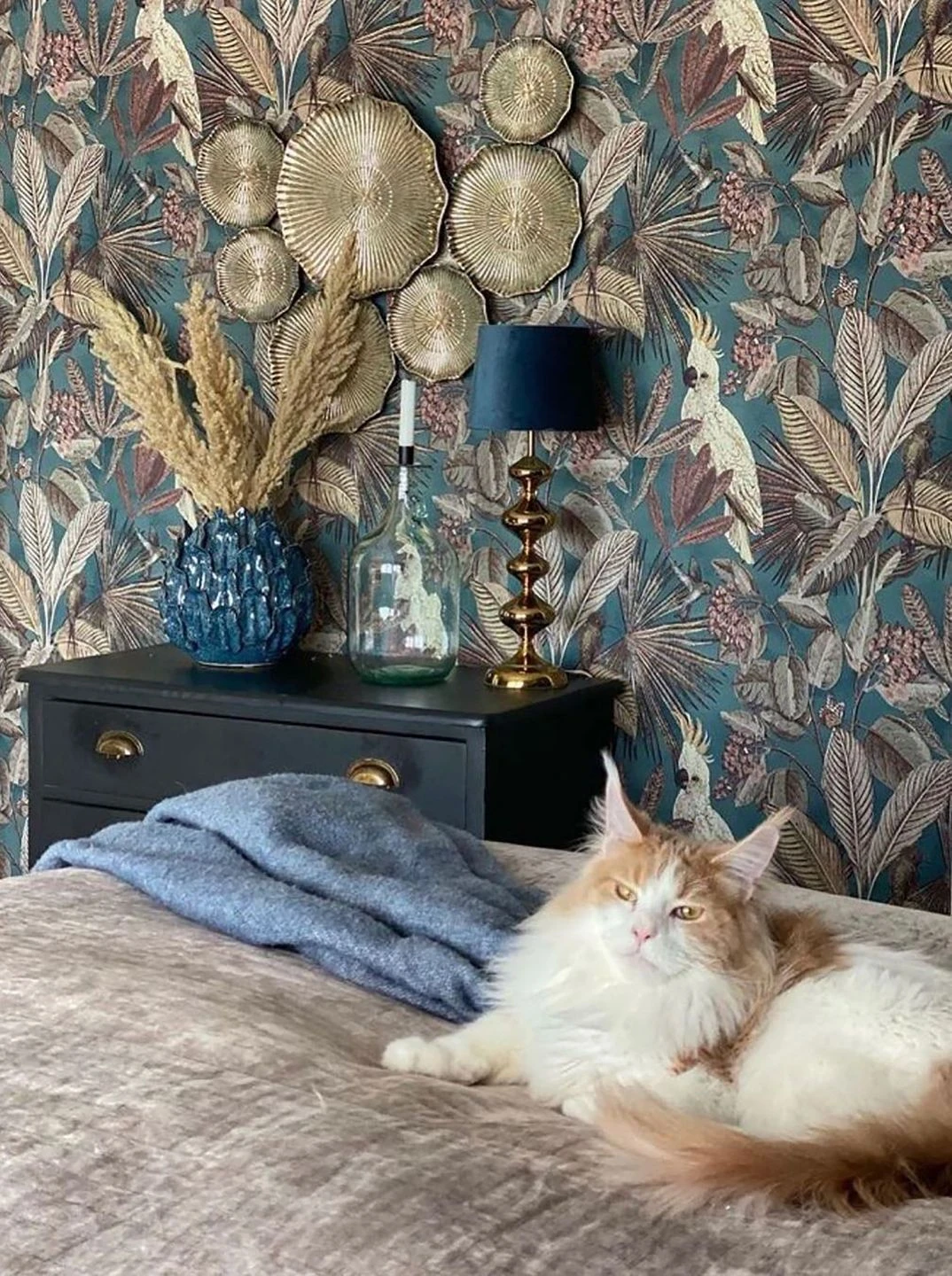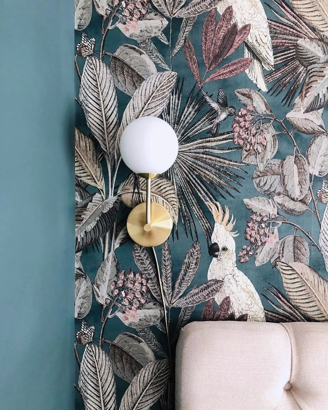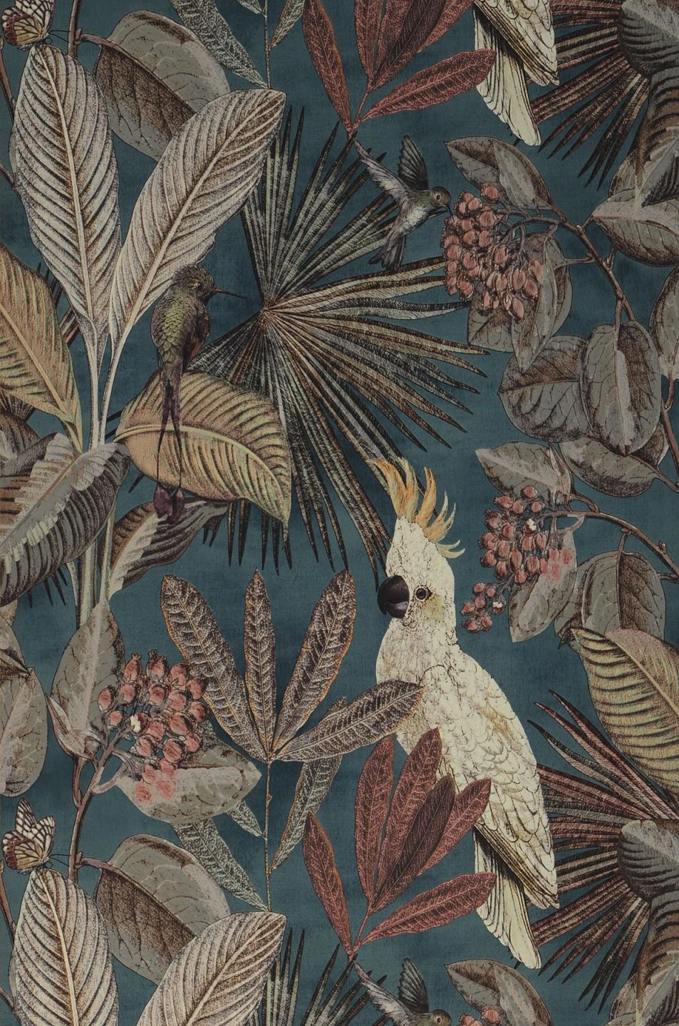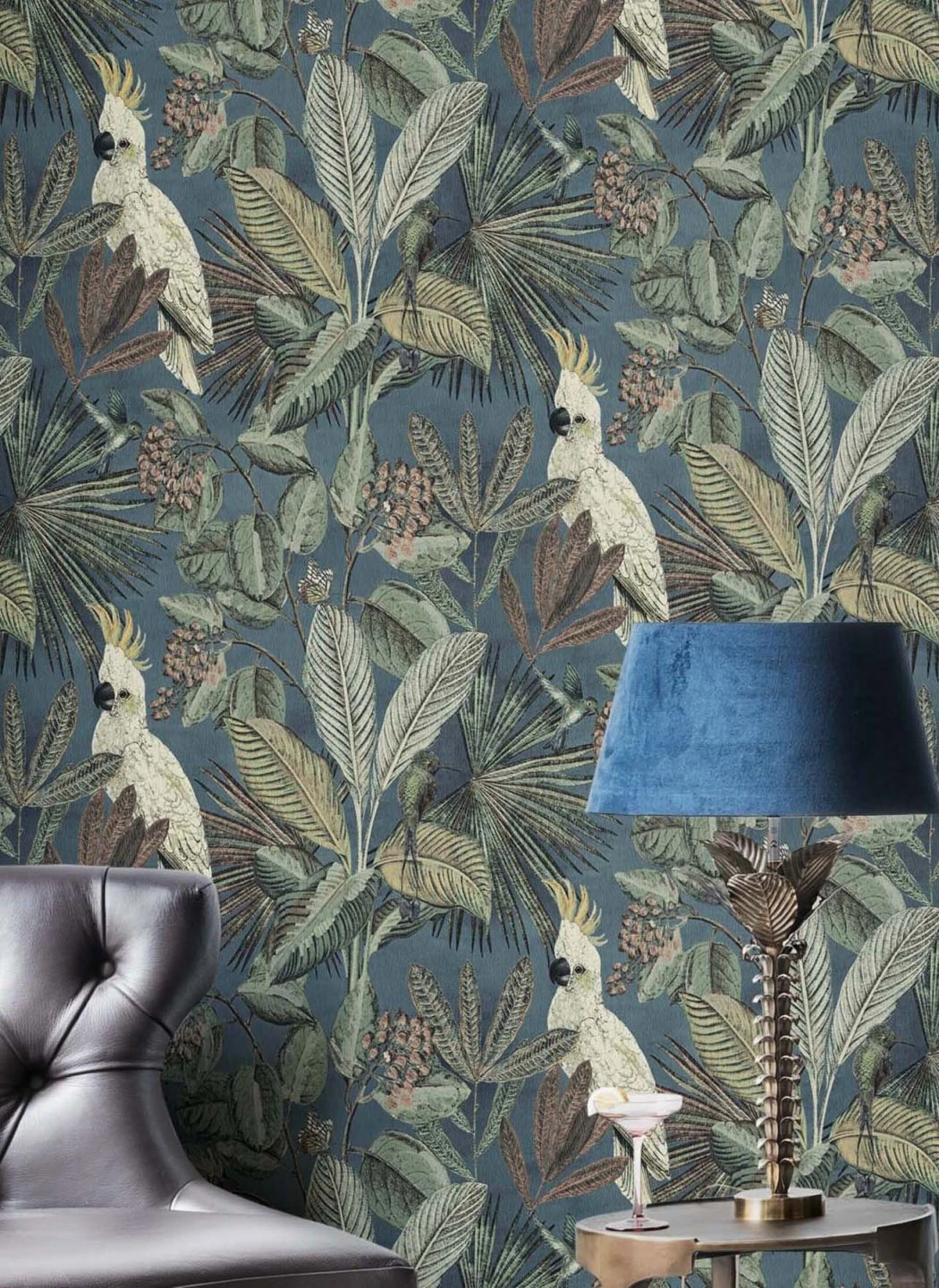 Bei diesem herrlichen Exotikmuster kommt Fernweh auf. Tropische Früchte, Palmen, Kakadus auf wirkungsvollem blaugrünem Fond lenken sofort vom tristen Alltag ab. Daher ist die pflegeleichte Vinyltapete, die auch in Feuchträumen problemlos eingesetzt werden kann, ideal zum Abtauchen in eine andere Welt.