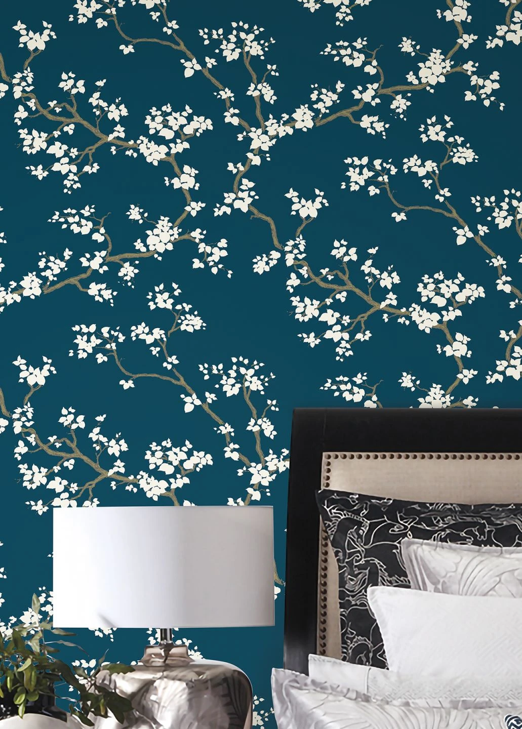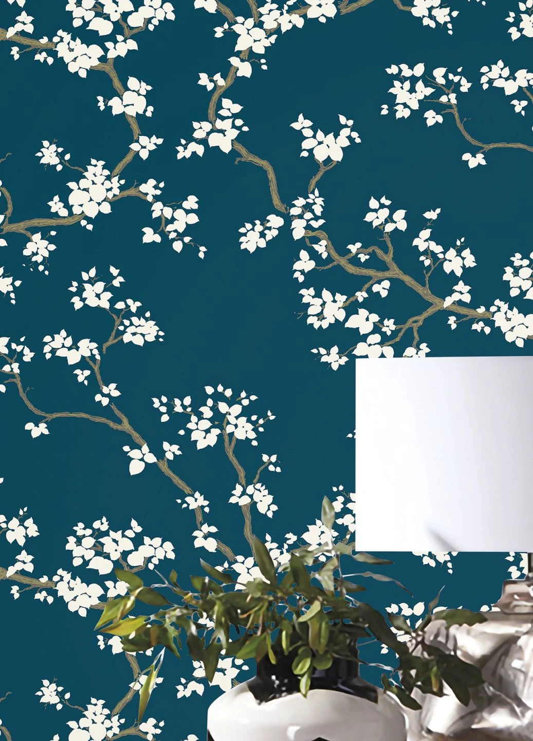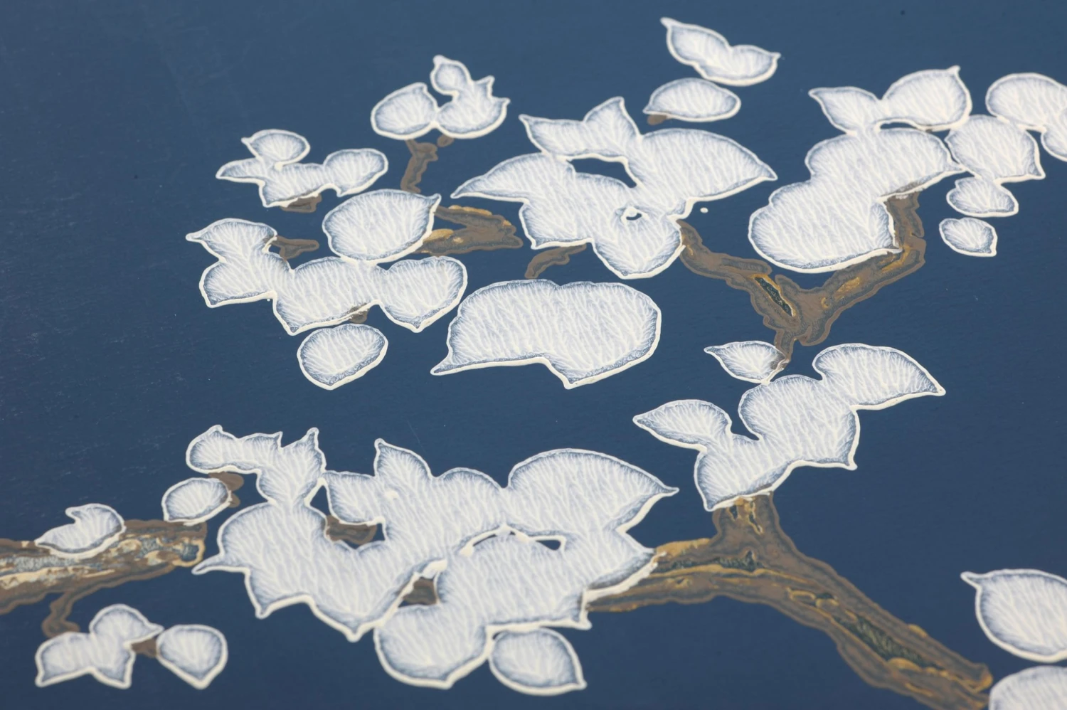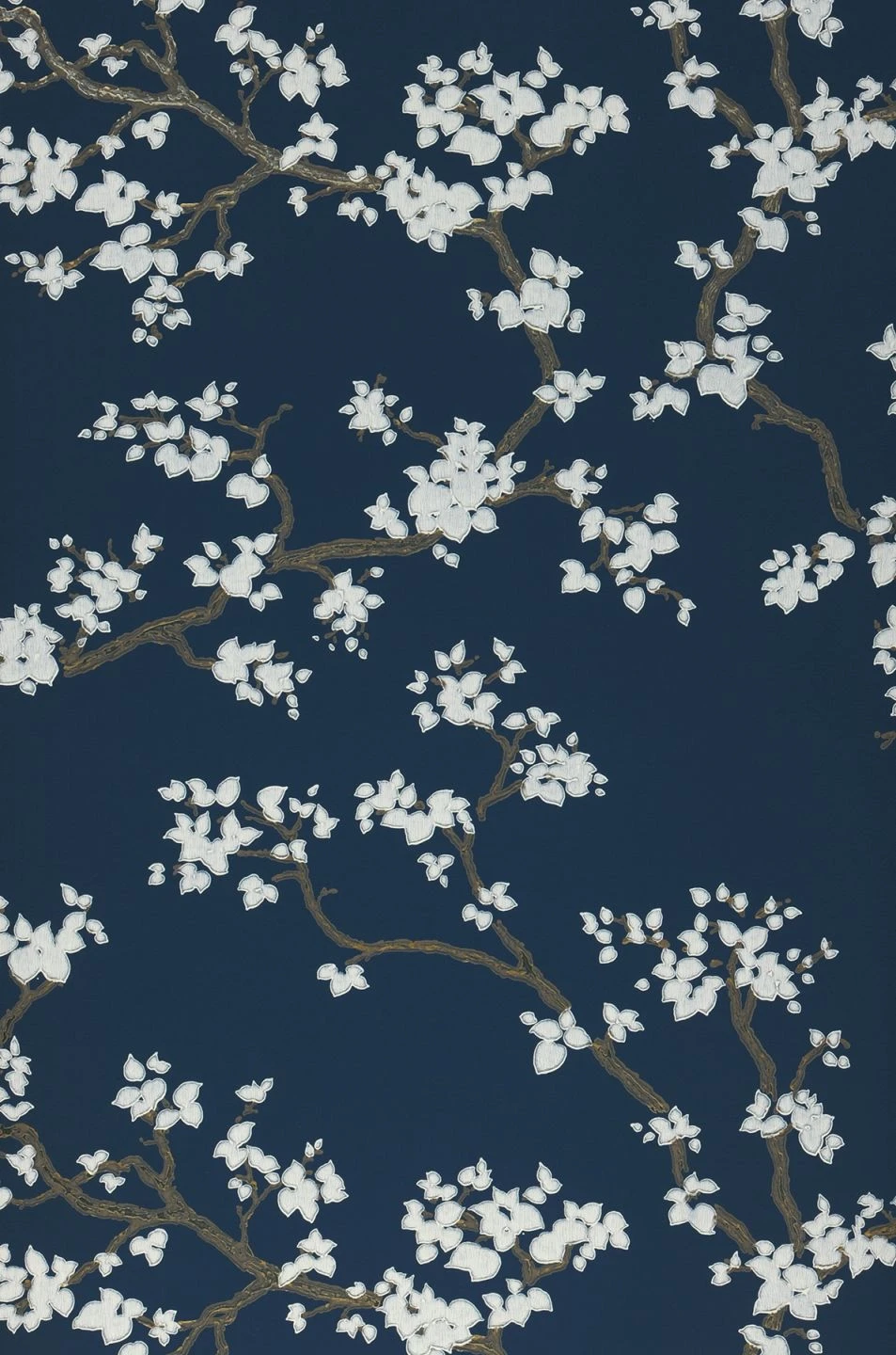 Das Design der im Leimdruckverfahren hergestellten Papiertapete greift die besondere Atmosphäre der japanischen Kirschblüte auf, die den Beginn des Sommerhalbjahrs markiert und mit traditionellen Festen begangen wird. Die schneeweißen Blüten entfalten vor dem kräftigen Grünblau des Untergrunds ihre intensive Leuchtkraft. Es entsteht der Eindruck, die Blüten vor dem leuchtend blauen Frühlingshimmel wahrzunehmen.