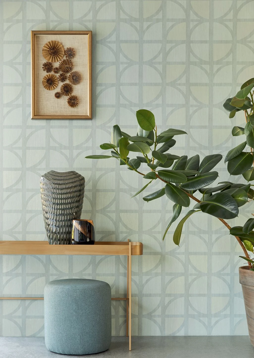 Das moderne geometrische Muster, welches durch seine Unergründbarkeit und Undefinierbarkeit die Blicke auf sich hält, bleibt dennoch in erfrischender Weise durch die Farbgebung in grünlichen Grautönen dezent. Es untermalt besondere Einrichtungen, die von außergewöhnlichen Formen im Design bestimmt werden.