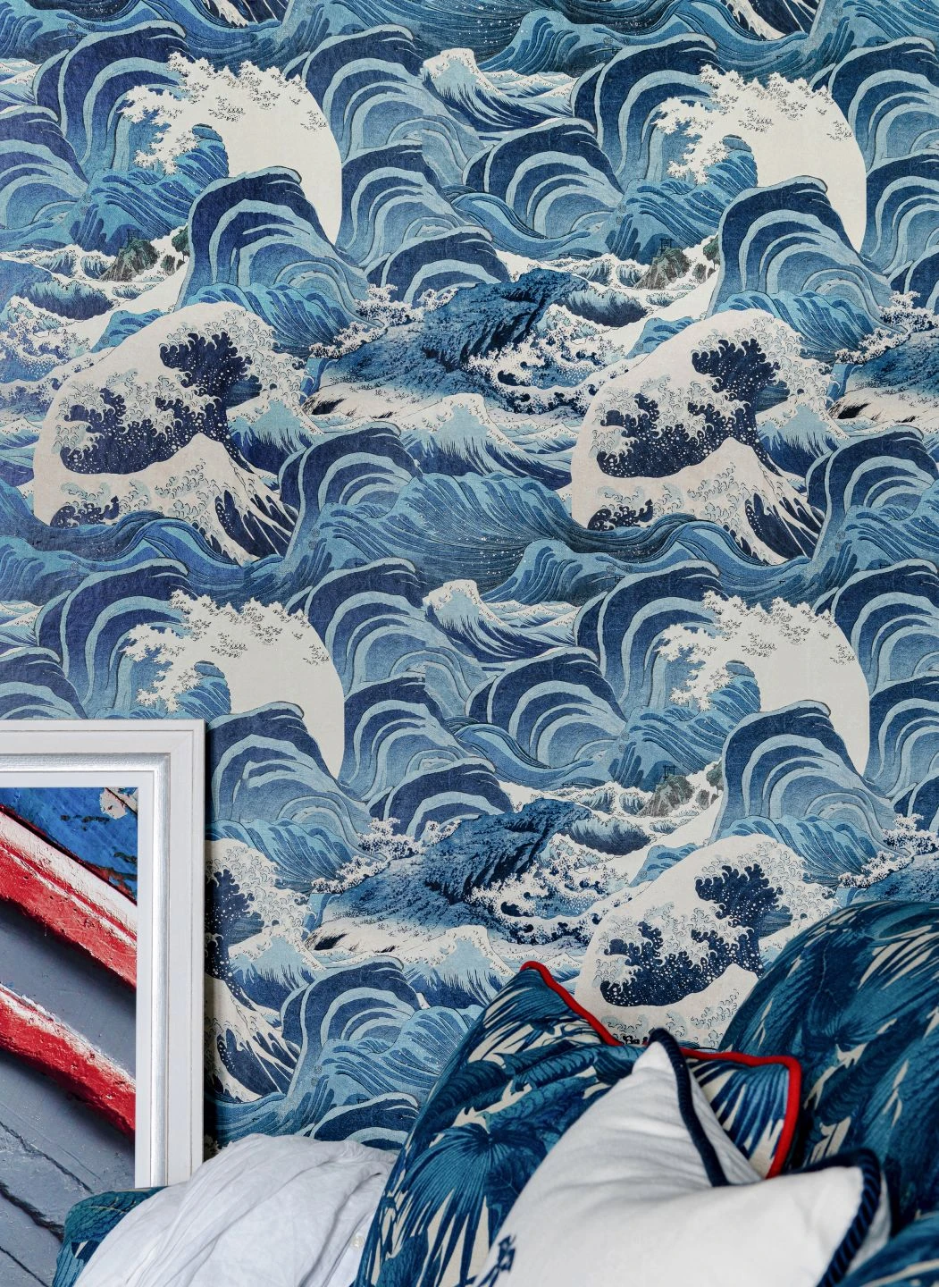Die Tapete Sea Waves fängt auf unnachahmliche Weise die immerwährende Bewegung der Wellen auf dem Meer ein. Ganz im Stil eines japanischen Farbholzschnitts sind die Wellen mit ihren verschiedenen Blautönen, ihren weißen Schaumkronen und der sprühenden Gischt dargestellt. Dabei wechselt die Perspektive fast unmerklich zwischen Nahaufnahme und Totale: Inmitten überdimensionaler Wellen ist ein Schrein auf einer felsigen, meerumtosten Insel zu erkennen.