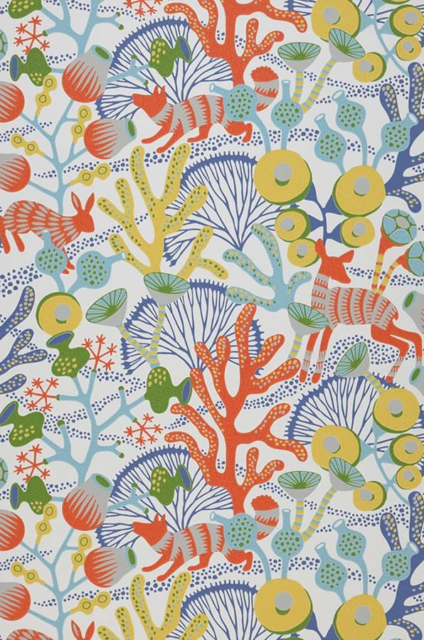 Dieses bizarre Blütengewirr mutet an wie eine Unterwasserlandschaft, dabei entführt sie uns in das Reich, wo sich Hase, Fuchs und Reh gute Nacht sagen. Auf dem Cremeweißen Untergrund leuchten Dunkelblau, Korallenrot, Minttürkis und Zitronengelb.