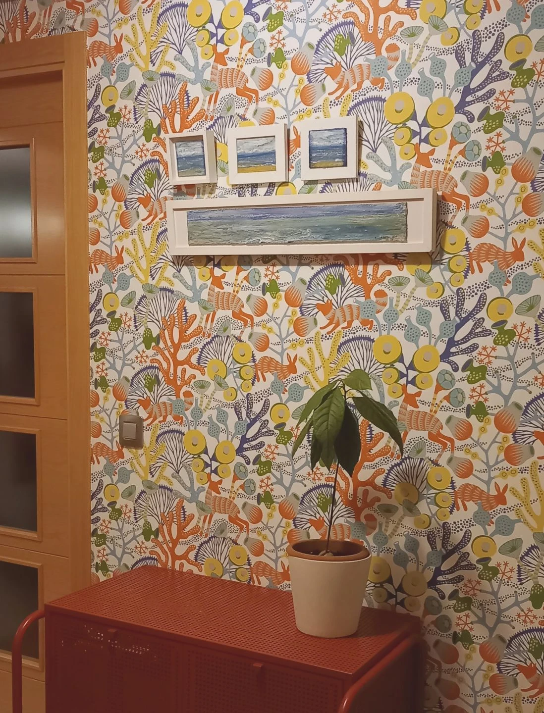 - MusterfarbeDunkelblau, Korallenrot, Minttürkis, Zitronengelb