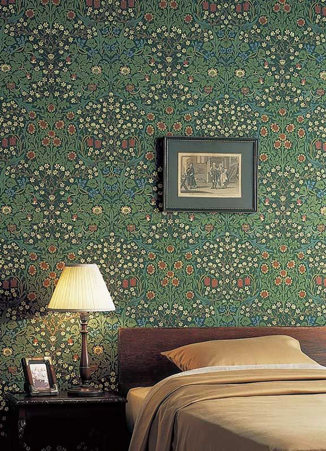Über und über mit blühenden Blumen bedeckt ist die englische Papiertapete von der traditionsreichen Marke Morris & Co. Bunte Blütenfarben und Blätter in verschiedenen Grüntönen auf schwarzgrünem Grund schaffen eine Fülle des Lebens, die durch die fast unmerklich symmetrische Anordnung zu einer zugrundeliegenden Ordnung findet. Das verwendete Leimdruckverfahren gibt dem Blumenmuster die Anmutung von Handwerkskunst und Zeitlosigkeit.