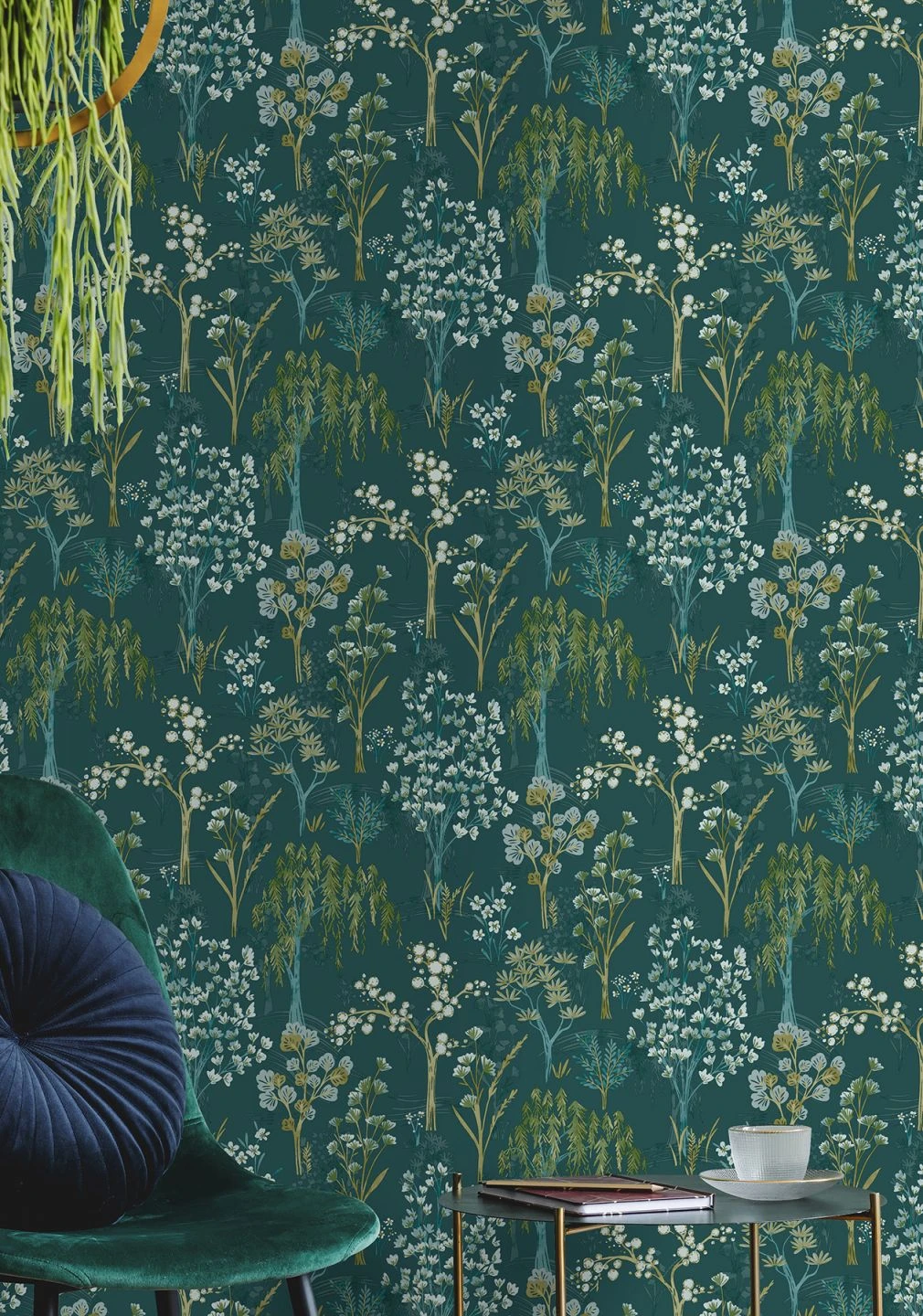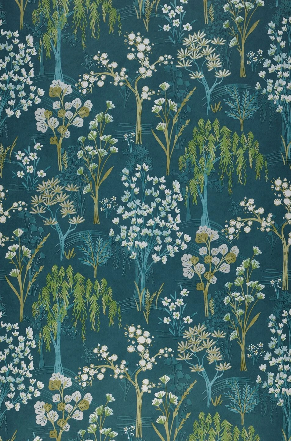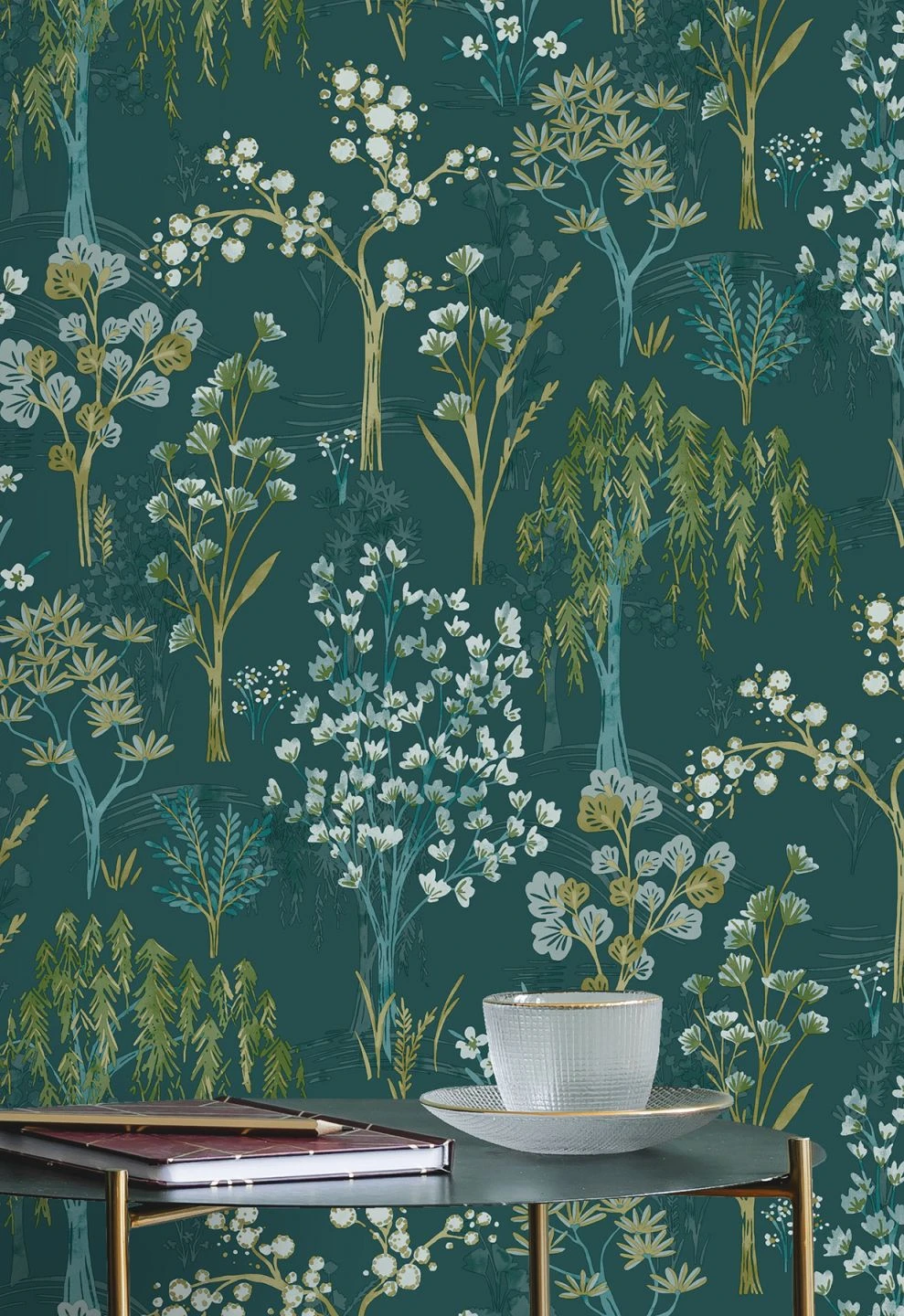 Tiefes, ruhiges Blaugrün bildet den Hintergrund für ein wahres Feuerwerk aus Blüten. Helle, leuchtende Blumen und in zarten Farben blühende Bäume mit jungen Blättern in verschiedenen frischen Grüntönen lassen eine stilisierte Parklandschaft entstehen. Die Vliestapete bietet eine wunderbare Kulisse, um den Blick schweifen zu lassen und inmitten des hektischen Alltags eine Oase der Ruhe und Entspannung zu genießen.