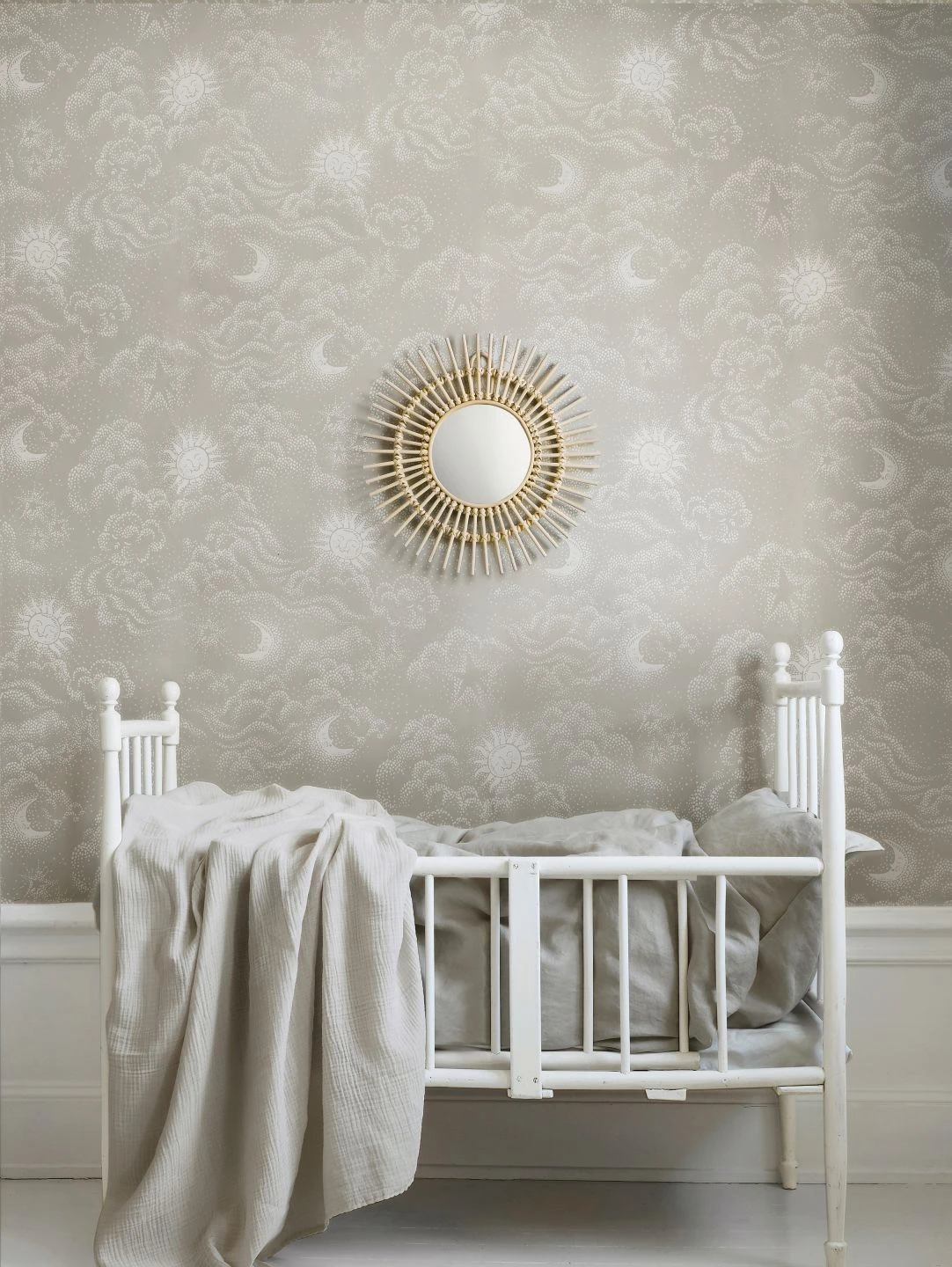 Die Sonne blickt lächelnd auf die Erde herab. Der Mond macht ein Nickerchen auf einer Wolke. Eine andere Wolke pustet mit aufgeblasenen Backen den Wind um die Erde. Der Himmel, der auf der wunderhübschen Kinderzimmertapete Sky Dreams dargestellt ist, ist freundlich und bietet Schutz. Das edel wirkende Seidengrau als Grundfarbe mit dem Grauweiß des Musters macht den Gesamteindruck der Tapete besonders harmonisch.