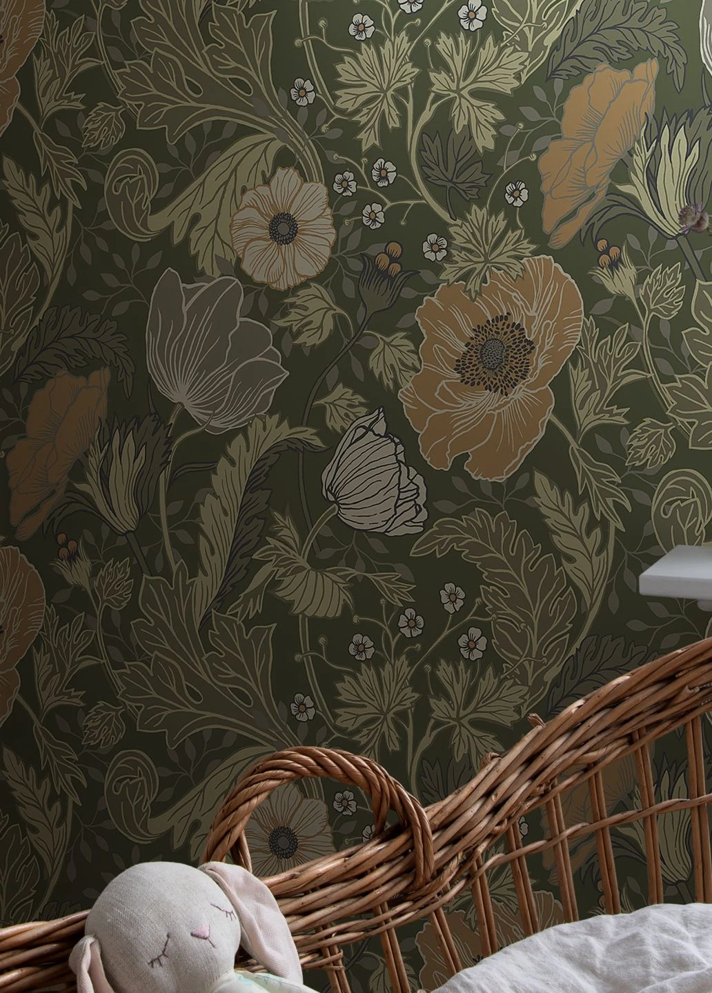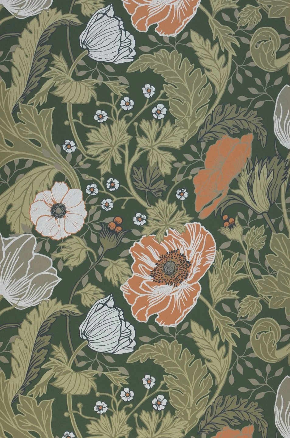 Das großflächige Blumenmuster in gedeckten Farben auf kieferngrünem Grund bringt einen Hauch von Nostalgie mit. Die ausladenden Blütenblätter der Mohnblumen in einem warmen Hellbraun fallen gleich ins Auge. Dazwischen Blüten in Grauweiß und Olivgrau mit filigran gezeichneten Blättern und reife Beeren. Zu antiken Möbeln in natürlichen Holztönen gibt Soria einen traumhaften, angemessenen Hintergrund ab.