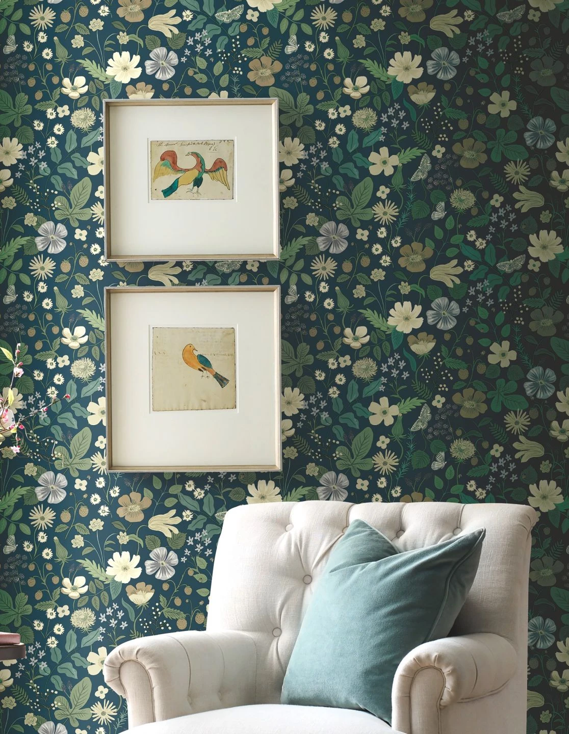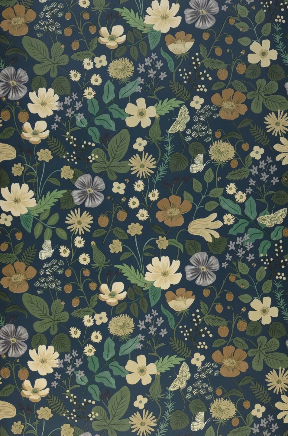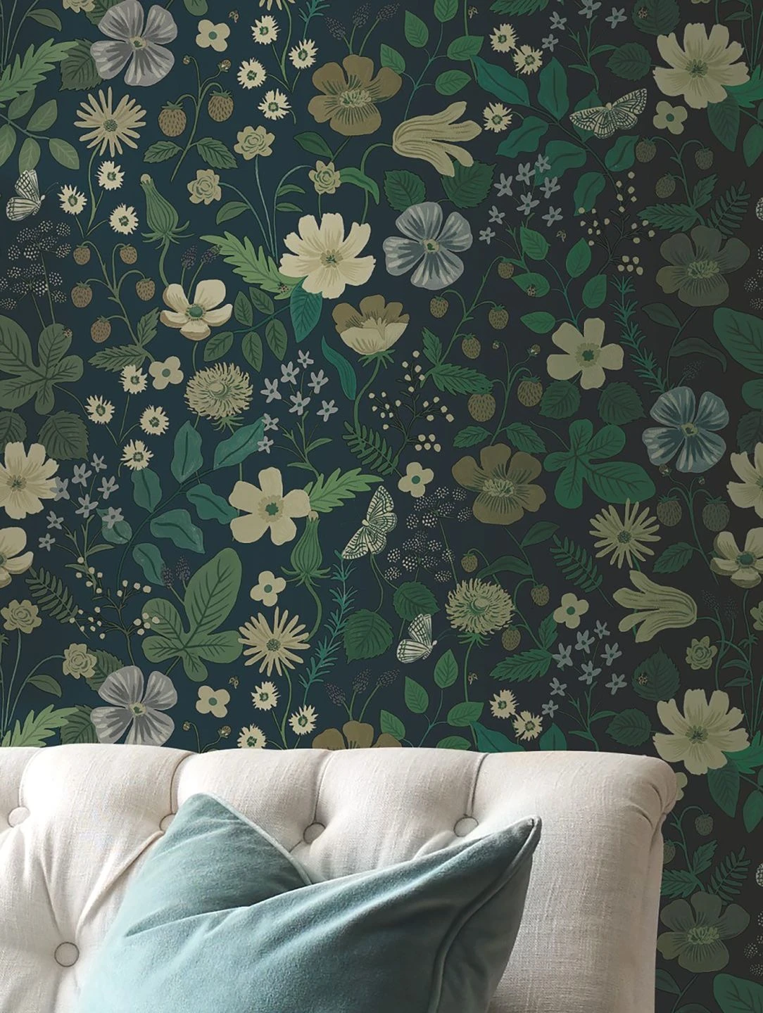 Eine prachtvolle Mischung der verschiedensten Blumen, dazwischen grüne Blätter, Erdbeeren und Schmetterlinge: Papiertapete Strawberry Garden im unverkennbar handgemalt wirkenden Stil von Rifle Paper bringt Ihnen die Fülle der Natur ins Haus. Die Farbwahl ist dabei ungeheuer harmonisch: Auf dem grünblauen Grund sind die vielfältigen Beige- und Grüntöne besonders ausdrucksstark und lassen sich prima mit Holztönen oder einer der verwendeten Farben kombinieren.