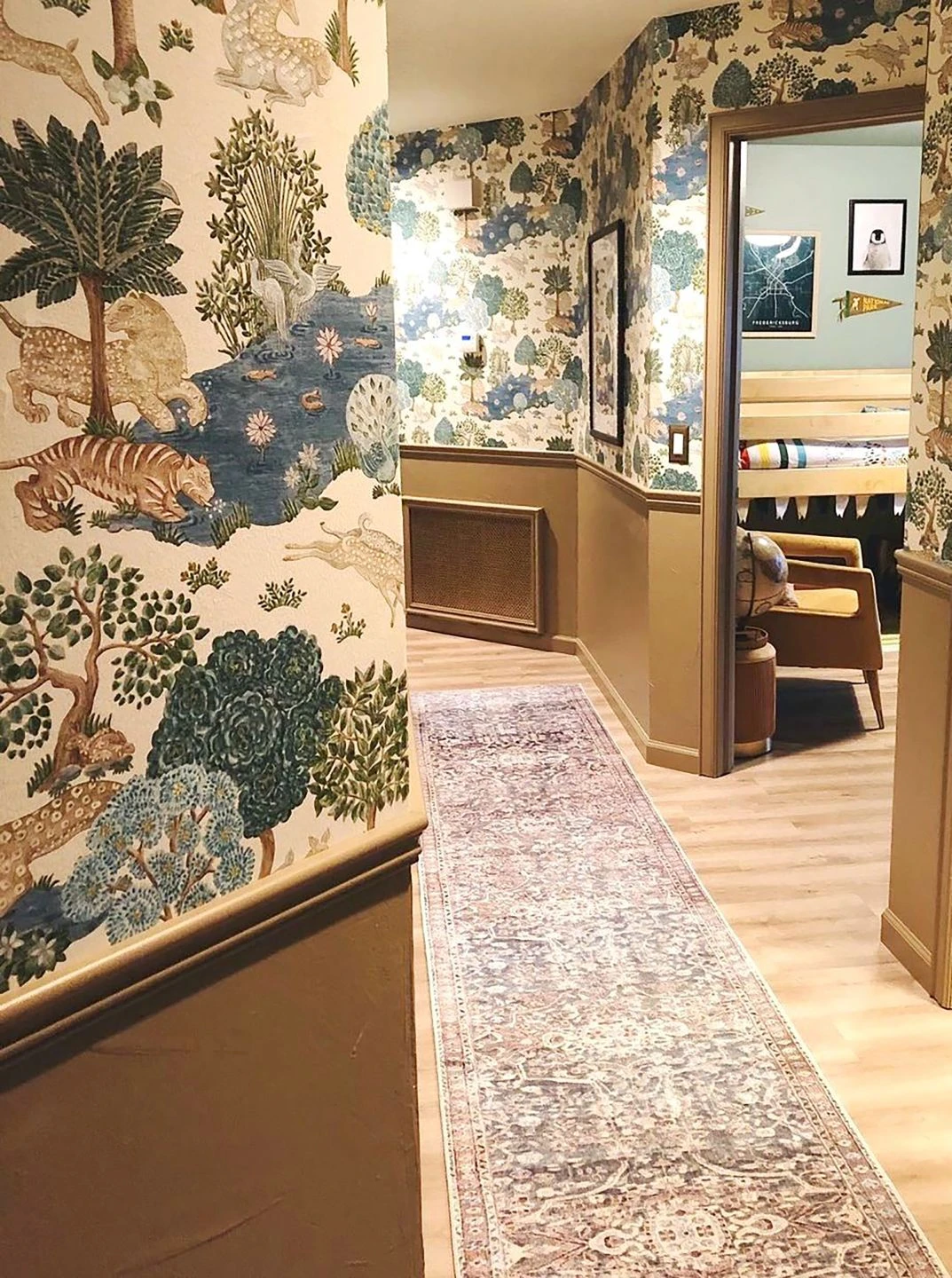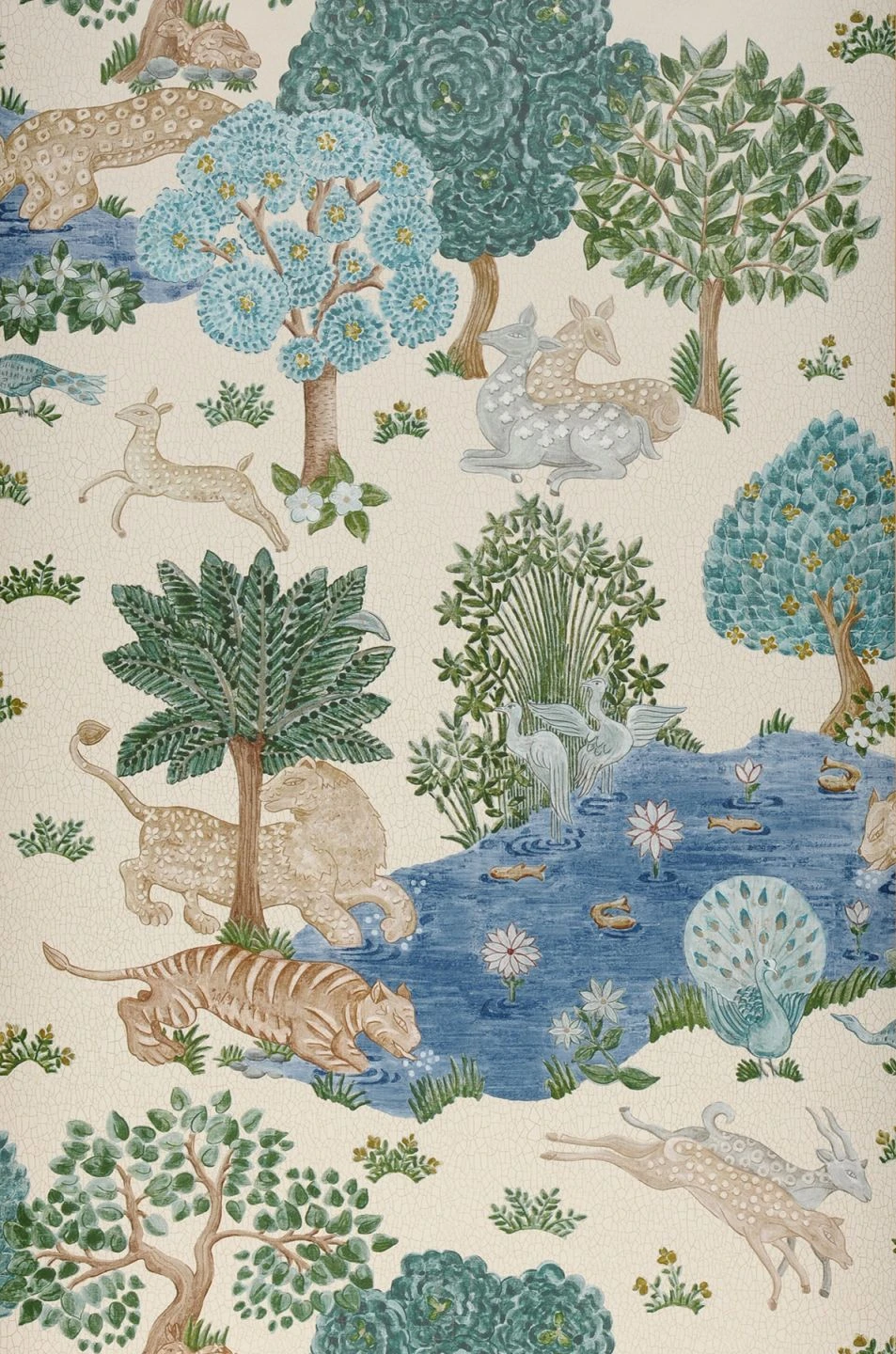 Eine paradiesische Landschaft mit phantasievoll gestalteten Bäumen, Teichen mit Goldfischen und Lotosblüten, friedlich trinkenden Tigern, Antilopen und Pfauen macht diese Tapete zu einem Augenschmaus. Die Darstellung im klassischen Stil indischer Malerei belebt Ihre Wände mit ihrer Vielfalt und ihrer geschmackvollen Farbgebung auf cremeweißem Grund und setzt wirkungsvoll perlgoldfarbene Highlights ein.