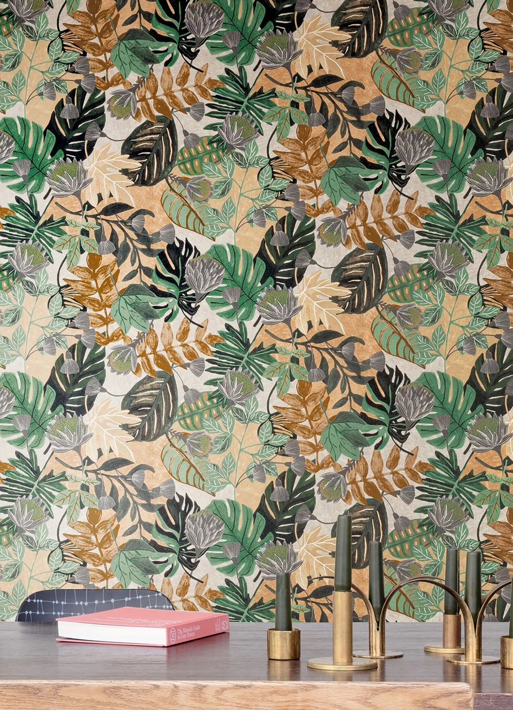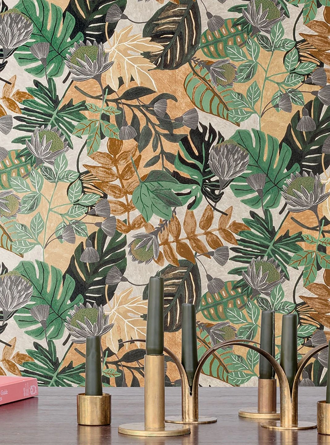 Üppig und dicht wie in einem Urwald bilden die Blüten und Blätter mit ihren exotischen Formen eine Kulisse voll von Leben und Natürlichkeit. Die Grün- und Brauntöne lockern Ihre Wände auf und setzen sich wie ein echter Wald zu einem wahren Flickenteppich unterschiedlicher Farbnuancen zusammen. Raffiniert ist auch der Untergrund der Vliestapete: Helles Beige, Braunbeige und Grauweiß erzeugen den Eindruck von unterschiedlich stark einfallendem Sonnenlicht.