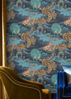 Der Blick schweift über eine Landschaft im fernöstlichen Stil: Bäume und Blumen, Wasserflächen mit Enten, an den Ufern schlagen Pfauen ihre Räder, dazwischen stehen kleine Tempel. Blautöne herrschen vor auf dem schwarzblauen Hintergrund und strahlen erholsame Ruhe aus. Akzentuiert werden sie durch Braunbeige und Creme. Einrichtungselemente im asiatischen Stil bilden eine attraktive Ergänzung zu diesem Wandschmuck.