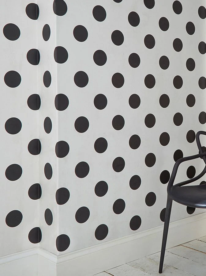 Die gepunktete Design Tapete erzielt wortwörtlich neue Wirkungskreise im Raum. Große schwarzweiße Punkte erzeugen eine Tiefenwirkung, die aus verschiedenen Perspektiven und je nach Betrachtungsintensität sehr variabel ist. Das Muster der waschbeständigen Vliestapete kann hervorragend mit Streifentapete der gleichen Farbstellung gemixt werden.