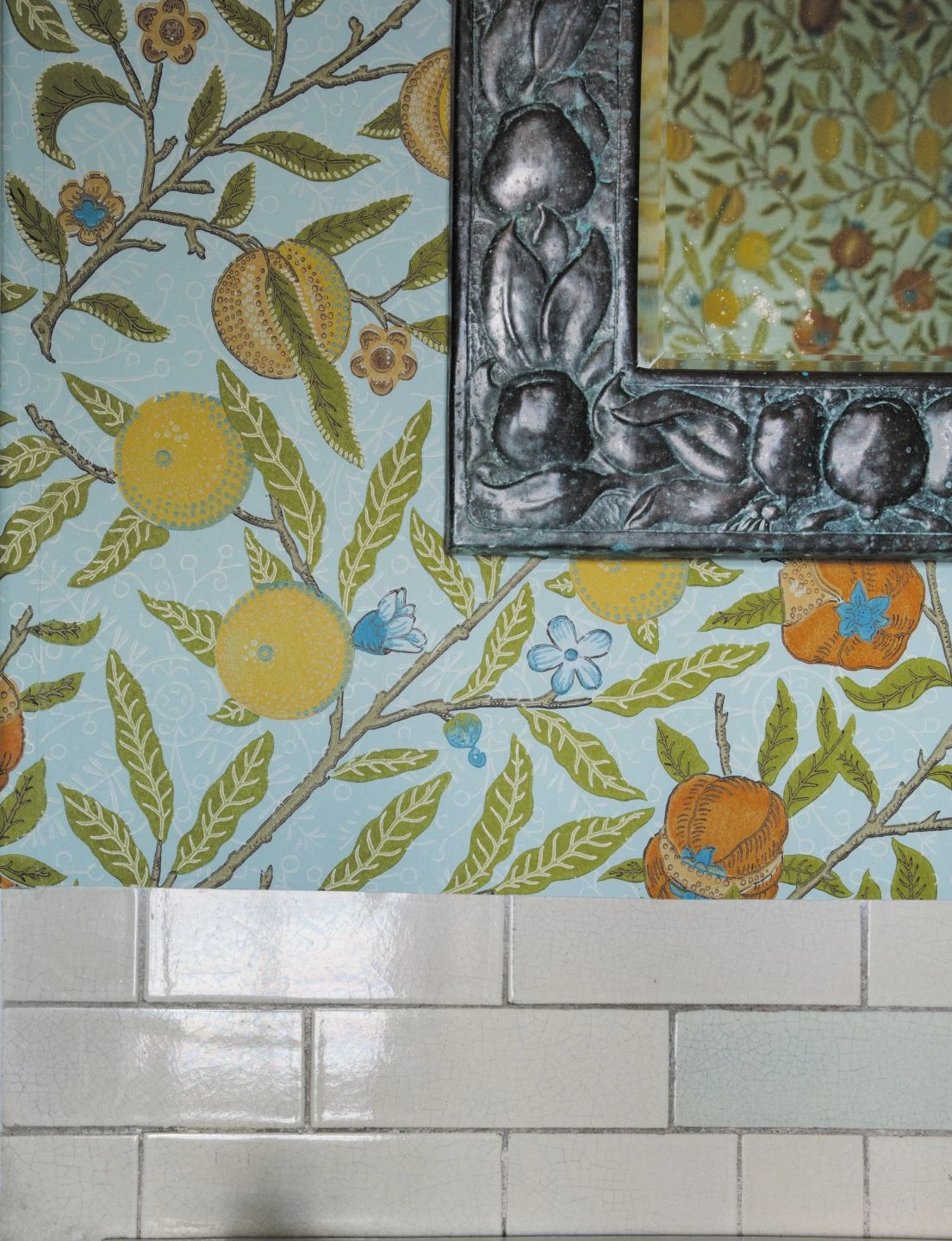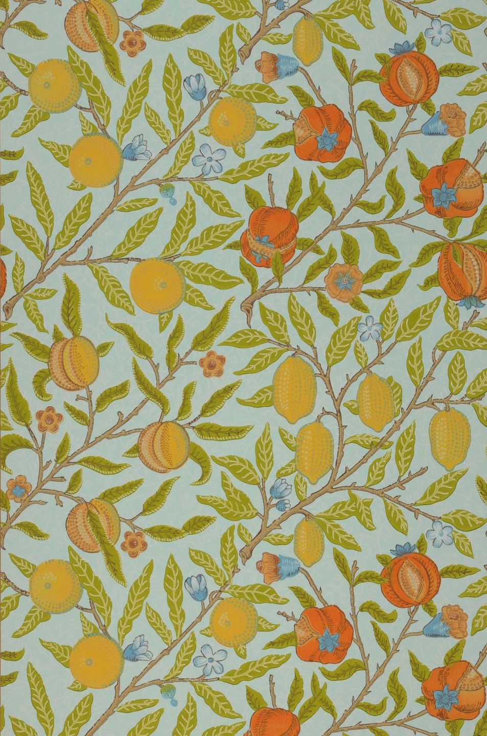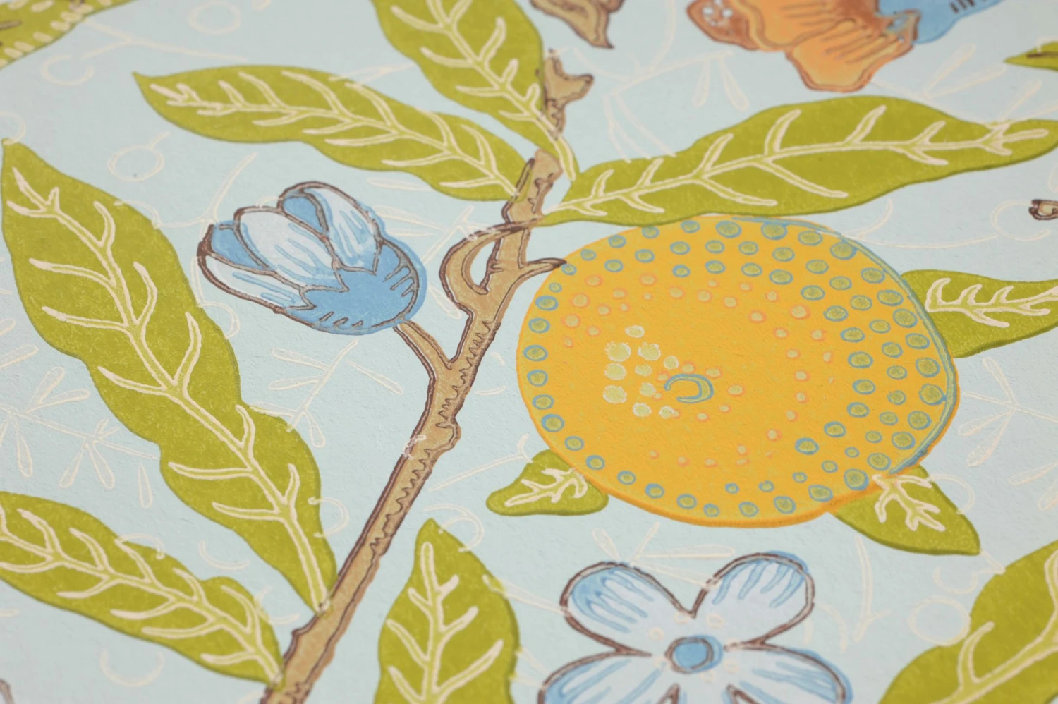 Als wäre durch die Zweige hindurch der wolkenlose Himmel zu sehen, liefert der zartblaue Grund von Papiertapete Therese einen perfekten Hintergrund für die abgebildeten Zweige, an denen Knospen und Blüten, aber auch reife Zitronen und Granatäpfel wachsen. So mischt das Design aus dem Hause Morris & Co. echten Vintage-Charakter mit der üppigen Vegetation Südeuropas zu einem faszinierenden Stück Wandschmuck. Ihre antiken Möbel verdienen eine so würdige Kulisse!