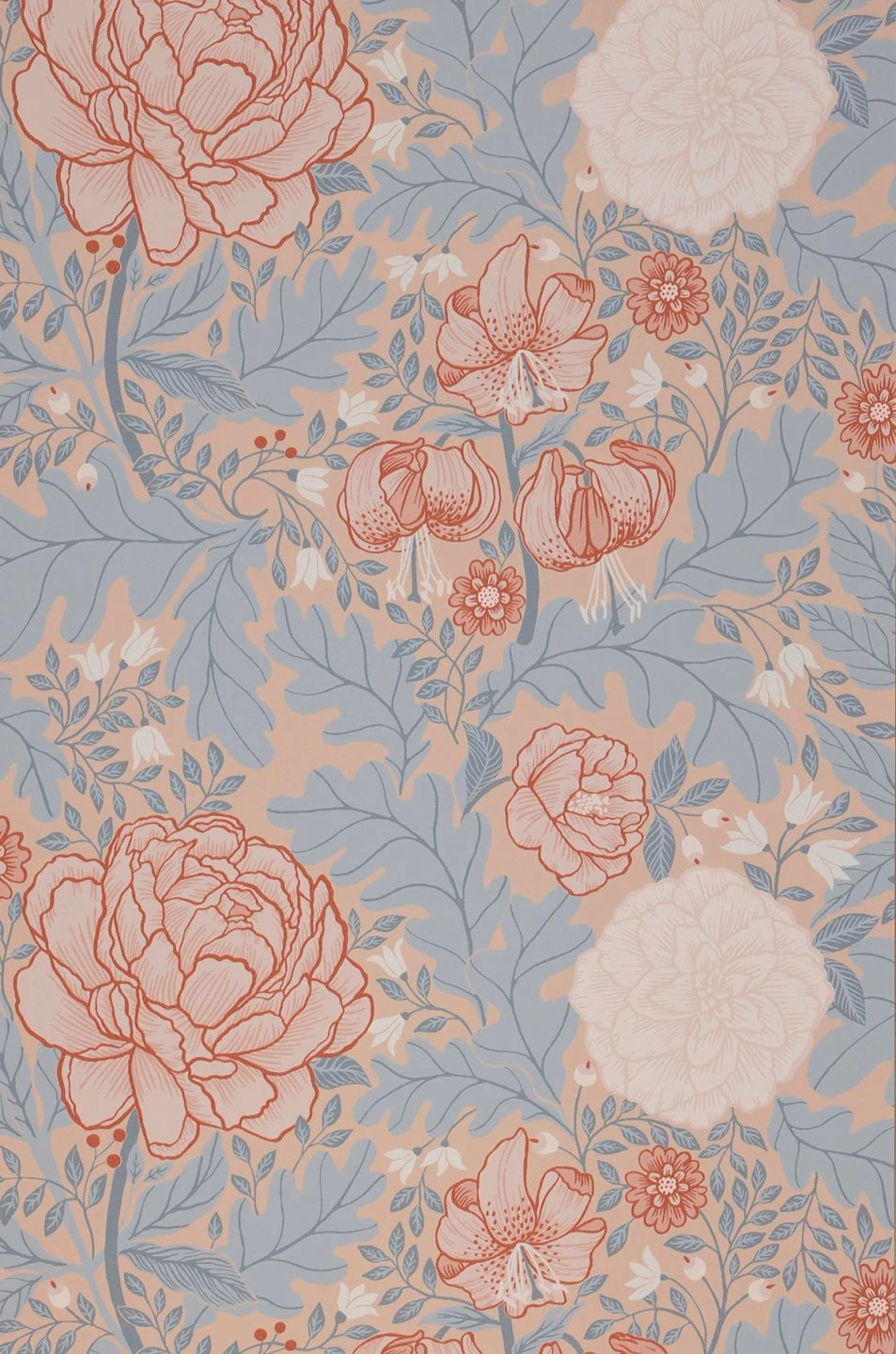 Eine faszinierende Kombination verschieden kräftiger Rosa- und Hellrottöne mit Blaugrau, Hellblau und Weiß verleiht dieser Vliestapete ihren unverwechselbaren Charakter. Durch verschieden starke Farbkontraste – einerseits zwischen den stilisierten Blüten und ihren Umrissen, andererseits zwischen den Blüten, Blättern und der Grundfarbe – ergibt sich der Eindruck verschiedener Bildebenen, die unterschiedlich weit vom Betrachter entfernt sind.