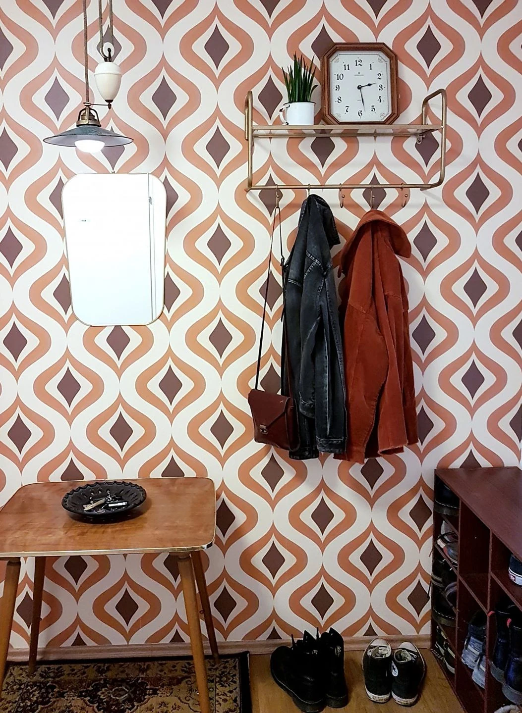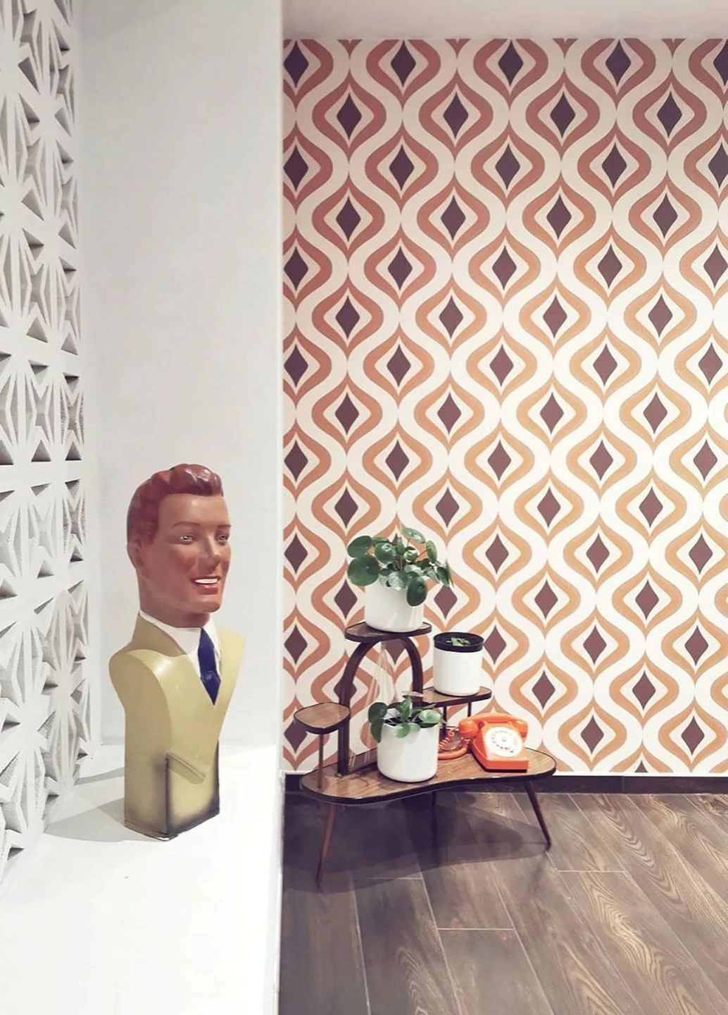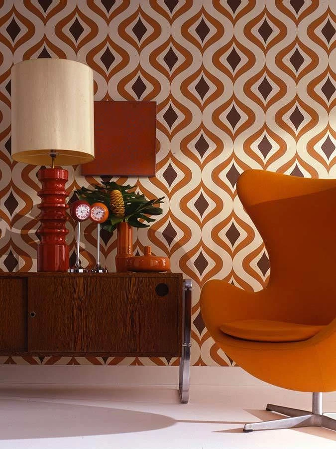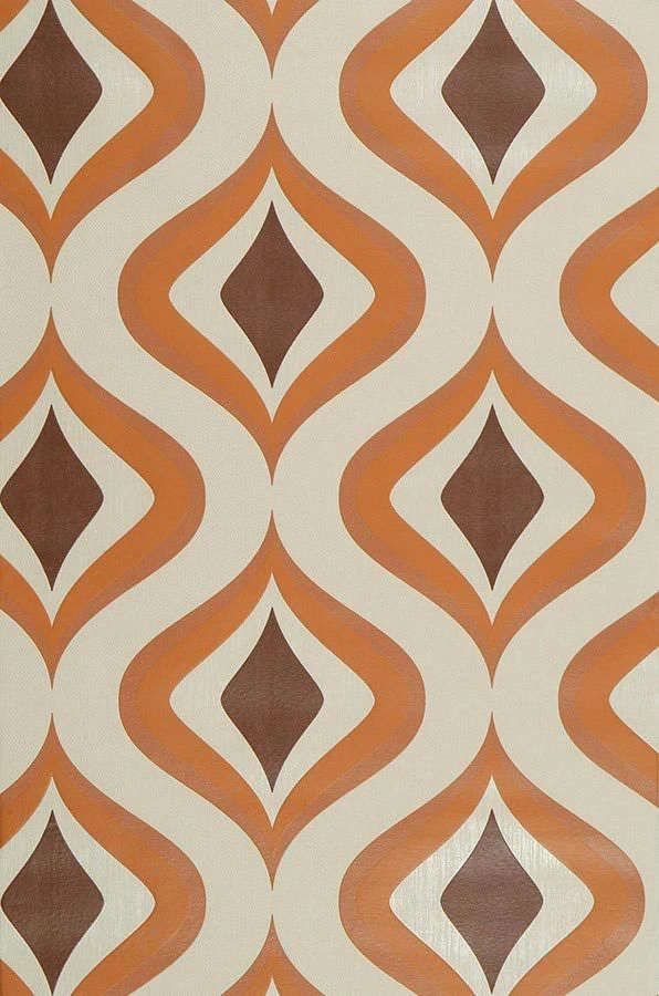 Das ausgeprägte Muster im Stil der 70er Jahre lässt an die geschwungenen, sich gegeneinander drehenden Formen eines vom Wind bewegten Mobiles denken. Die sanften, abgerundeten Rauten und Wellenlinien in Orange, Braun und Hellelfenbein, die als Relief in der Vinyloberfläche fühlbar sind, passen perfekt zu Möbeln im Retro-Stil. Die waschbeständige Tapete lässt sich sogar in Ihrem Bad stilvoll einsetzen.