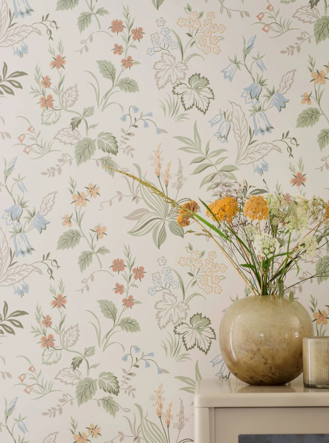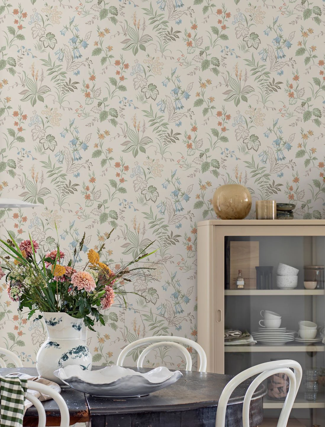 Duftig und zart sind die Blumen, Gräser und Kräuter, die wie zufällig auf der Fläche Ihrer Wand verstreut sind wie auf einer blühenden Sommerwiese. Die hellen Grün-, Beige- und Blautöne und das Orangebraun auf dem grauweißen Grund lassen die Vliestapete leicht und luftig wirken. Mit einem Hauch von folkloristischem Stil bereichert Ulrika den skandinavischen oder den Landhausstil um sommerliche Natürlichkeit und Frische.