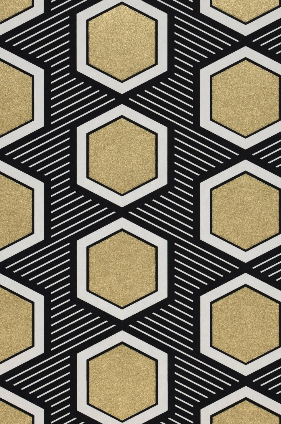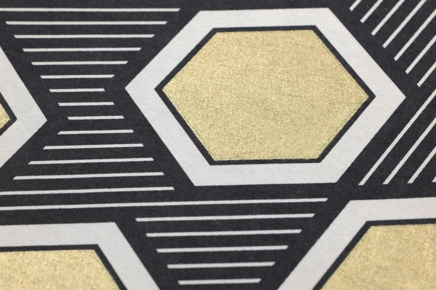 Das ist Geometrie in Perfektion: Goldfarbene Sechsecke, umrandet von weißen und schwarzen Rahmen, auf einem schwarzweiß gestreiften Grund kreieren eine ausdrucksstarke Kulisse für jeden Raum, den Sie mit Uroko dekorieren. Das sachliche Design erhält durch das schimmernde Gelbgold der Hexagone einen ausgeprägten Touch ins Glamouröse und verbindet Form und Farbe zu einem reizvollen, kontrastreichen Gesamtbild.
