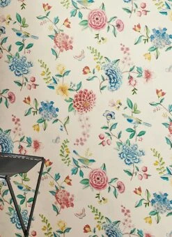 Frische Farben, die Leichtigkeit einer Sommerwiese voller Blüten und Schmetterlinge, dazwischen bunte Vögel und in zartem Hellblau angedeutete Silhouetten von Blumen – die Vliestapete strahlt Lebensfreude und sommerliche Wärme aus. Die Oberfläche besteht aus Vinyl, das die Farben leuchten lässt und eine spürbare Struktur wie ein textiles Gewebe aufweist. Das Material ist waschbeständig und eignet sich für jeden Raum – sogar für Ihr Badezimmer.