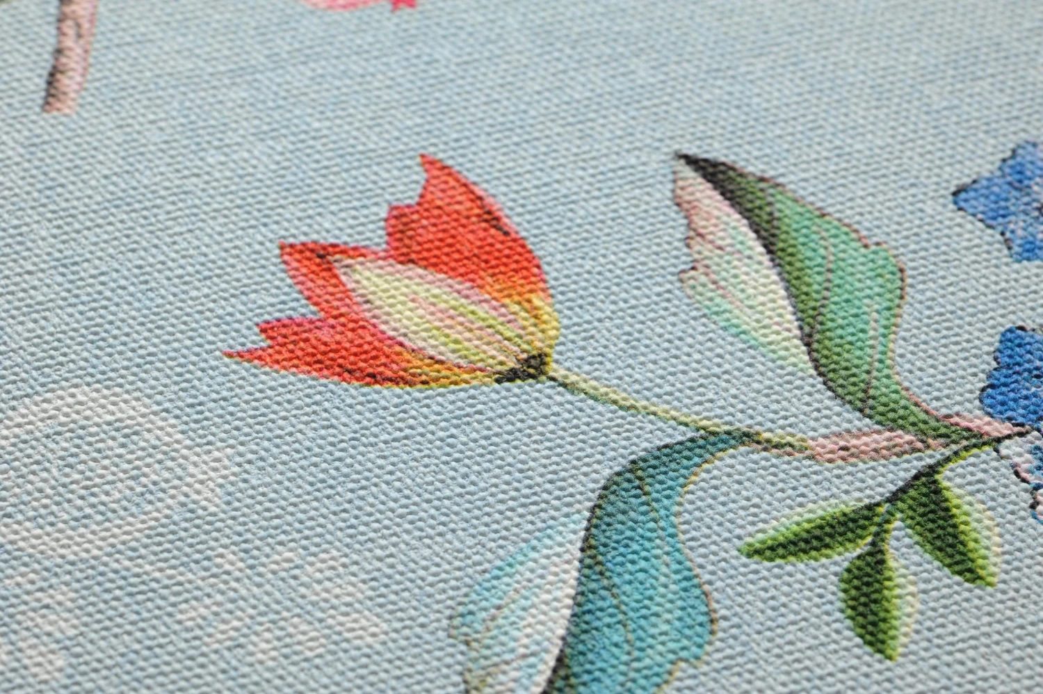 Auf hellblauem Grund finden sich Blüten, Schmetterlinge und Vögel in freundlichen Farben. Teilweise in zarten Farbschattierungen ausgefüllt, teilweise durch weiße Umrisse angedeutet, bringen sie den Sommer mit. Die Oberfläche der Vliestapete besteht aus Vinyl, das eine spürbar textilähnliche Struktur aufweist, und ist dadurch selbst für das Badezimmer ein stimmungsvoller Wandschmuck. Aber auch jeden anderen Raum bringt die Tapete – gerade in Verbindung mit weißen Einrichtungselementen – zum Strahlen.