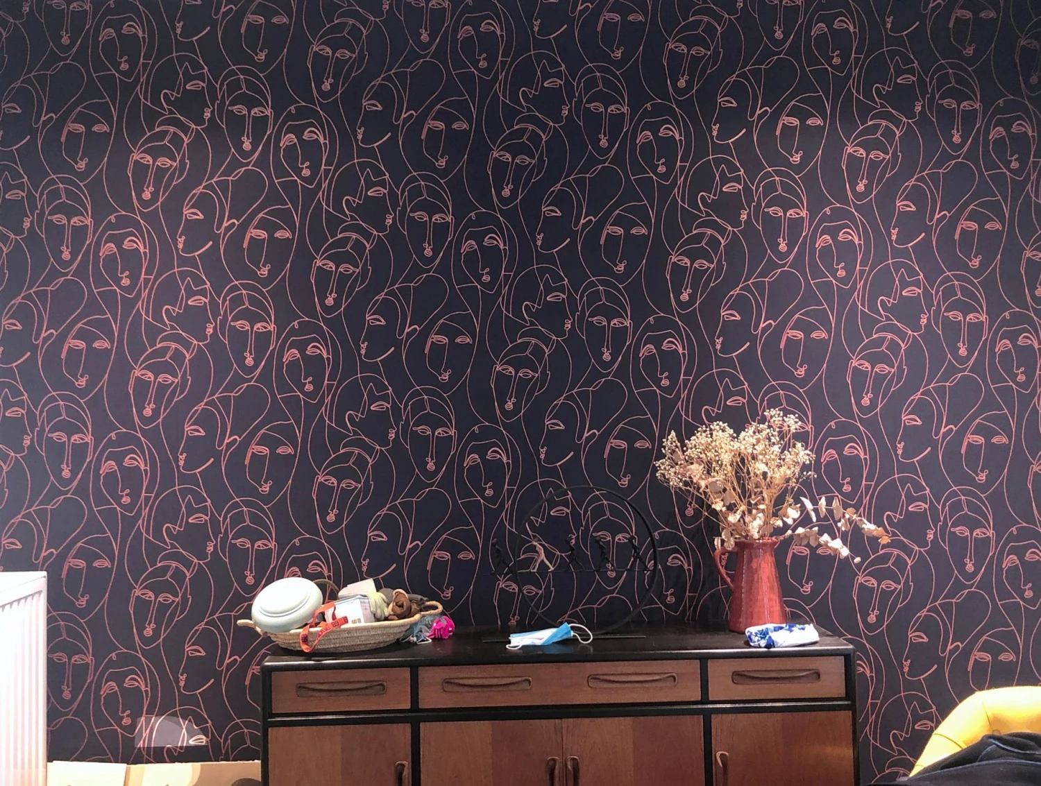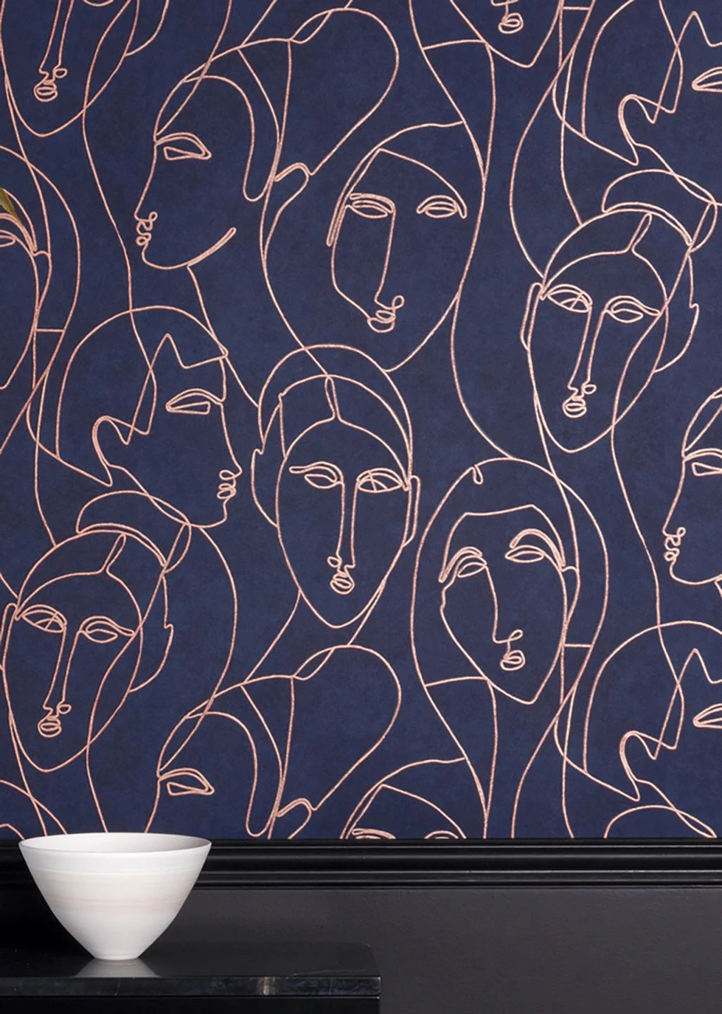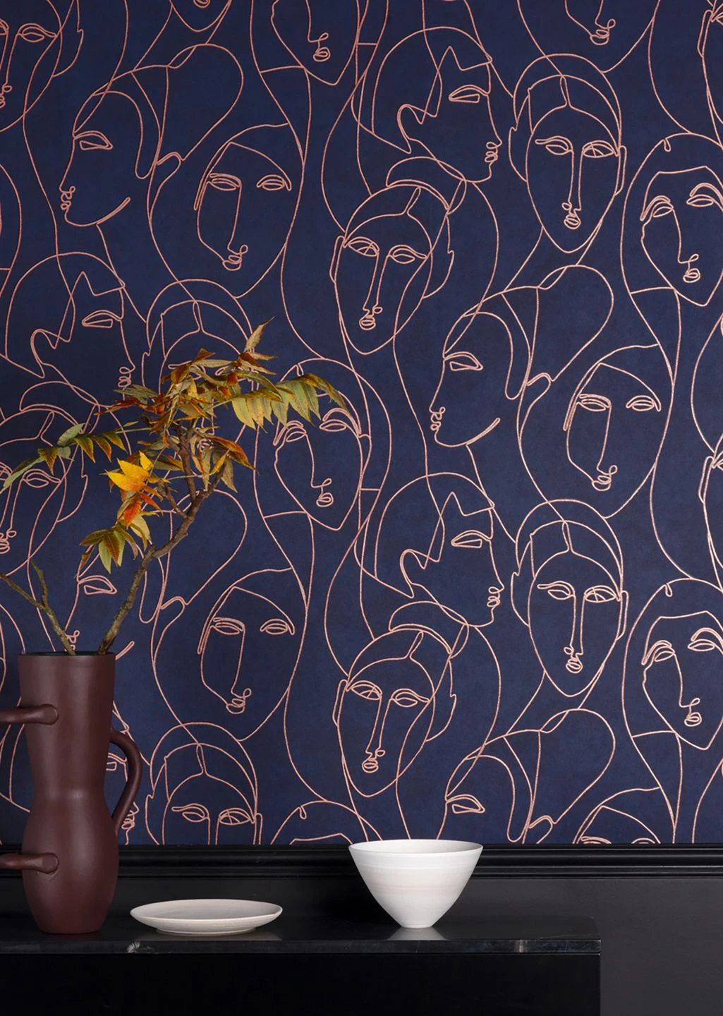 Stilisierte Gesichter entstehen durch lachsrot schimmernde Linien auf dem tief stahlblauen Grund. Der reizvolle Farbkontrast betont die kunstvoll angedeuteten Köpfe. Wie die moderne künstlerische Darstellung einer Menschenmenge in der Großstadt wirken die Gesichter anonym und dennoch ausdrucksvoll. Die außergewöhnliche Vliestapete gibt Ihren vier Wänden einen Hauch von moderner Kunst.