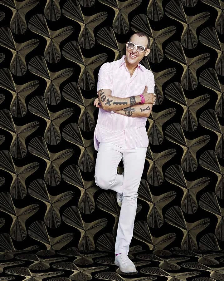 Goldene Spiralen auf dunklem Untergrund versetzen uns in Schwingung, denn das bewegte Linienspiel erzeugt eine besondere Perspektive für Zeit und Raum. Ein Meisterwerk von Design Karim Rashid.